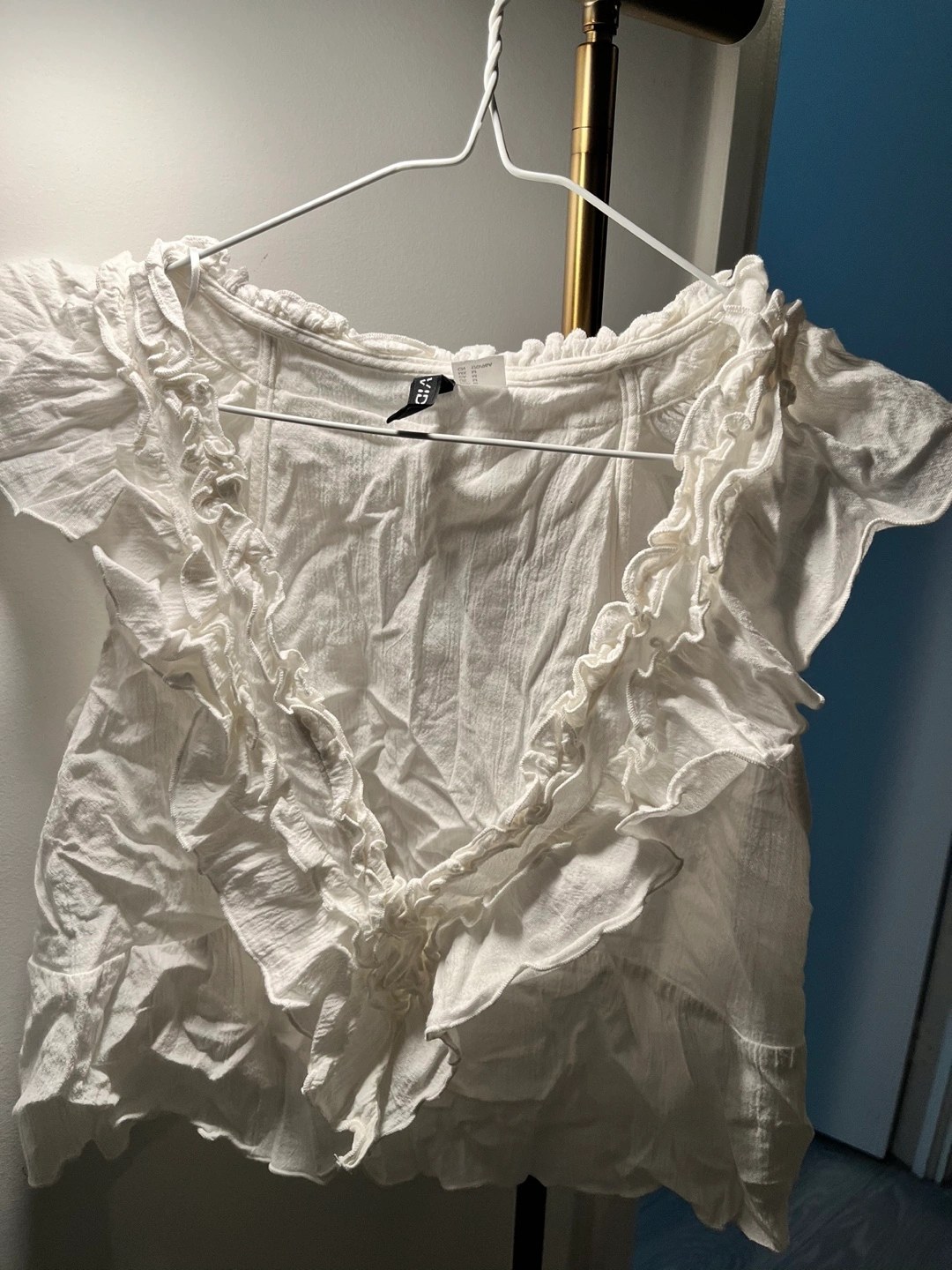 Adorable white cropped blouse. Features ruffles along the neckline and sleeves. Lightweight and airy fabric. Perfect for summer.