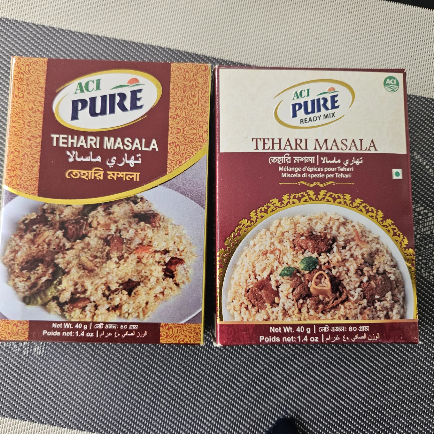 ACI Pure Tehari Masala Ready Mix. Each box contains 40g (1.4 oz) of spice mix. This spice blend is designed for making Tehari. BB dates February and May 2026