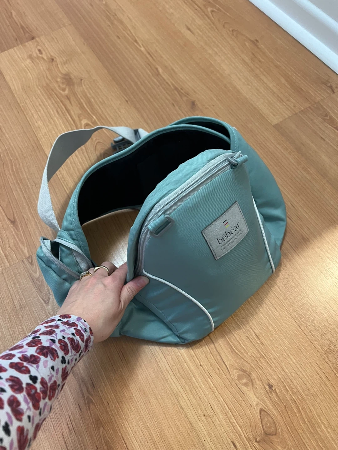 This is a bebear baby hip seat carrier. It's a teal colour and made of durable fabric. It features a padded hip seat for comfortable carrying. It also has an attachment to make it a regular carrier that is hands free with baby facing you.