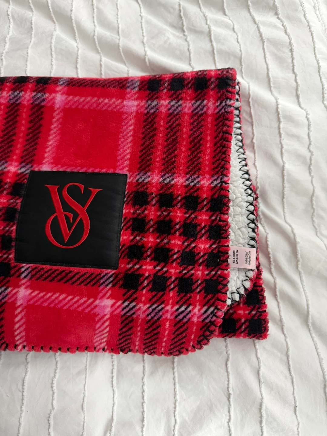 Cozy Victoria's Secret fleece blanket in a red and black plaid design. It's super soft and has a sherpa lining on the back. Perfect for snuggling up on the couch or adding a warm layer to your bed!