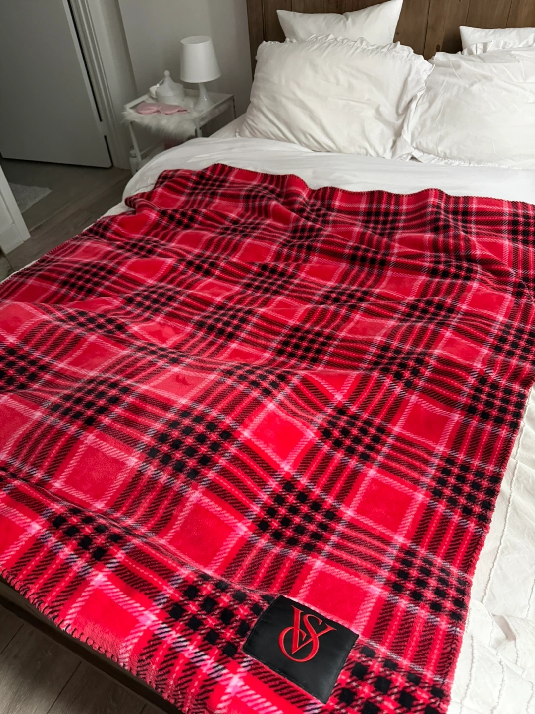 Cozy Victoria's Secret fleece blanket in a red and black plaid design. It's super soft and has a sherpa lining on the back. Perfect for snuggling up on the couch or adding a warm layer to your bed!