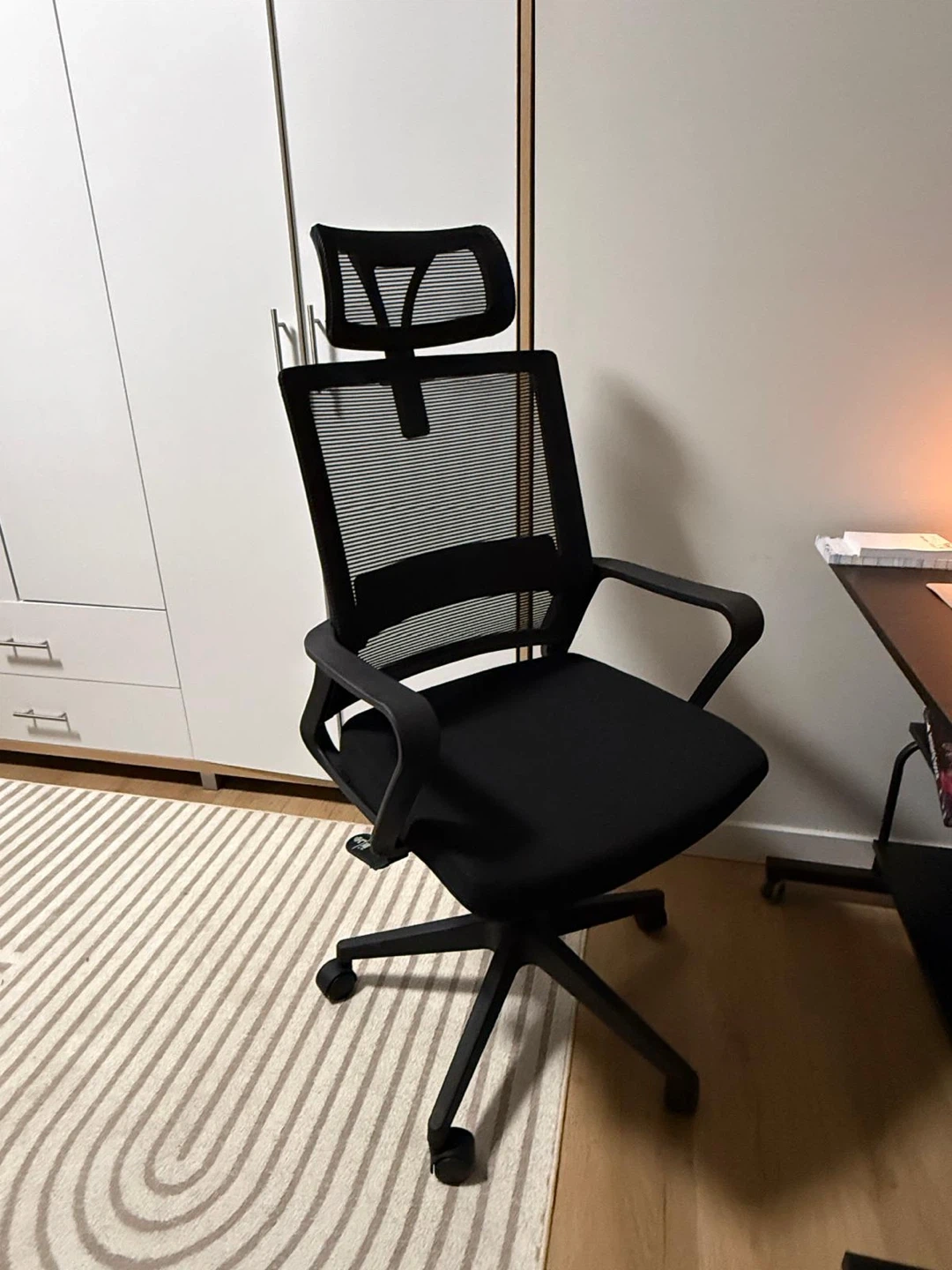 Black Mesh Office Chair with Headrest and table