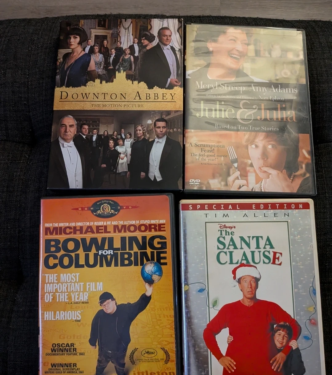 Collection of four DVDs including Downton Abbey, Julie & Julia, Michael Moore's Bowling for Columbine, and Disney's The Santa Clause Special Edition. Bowling for Columbine is an Oscar winner for Documentary Feature.