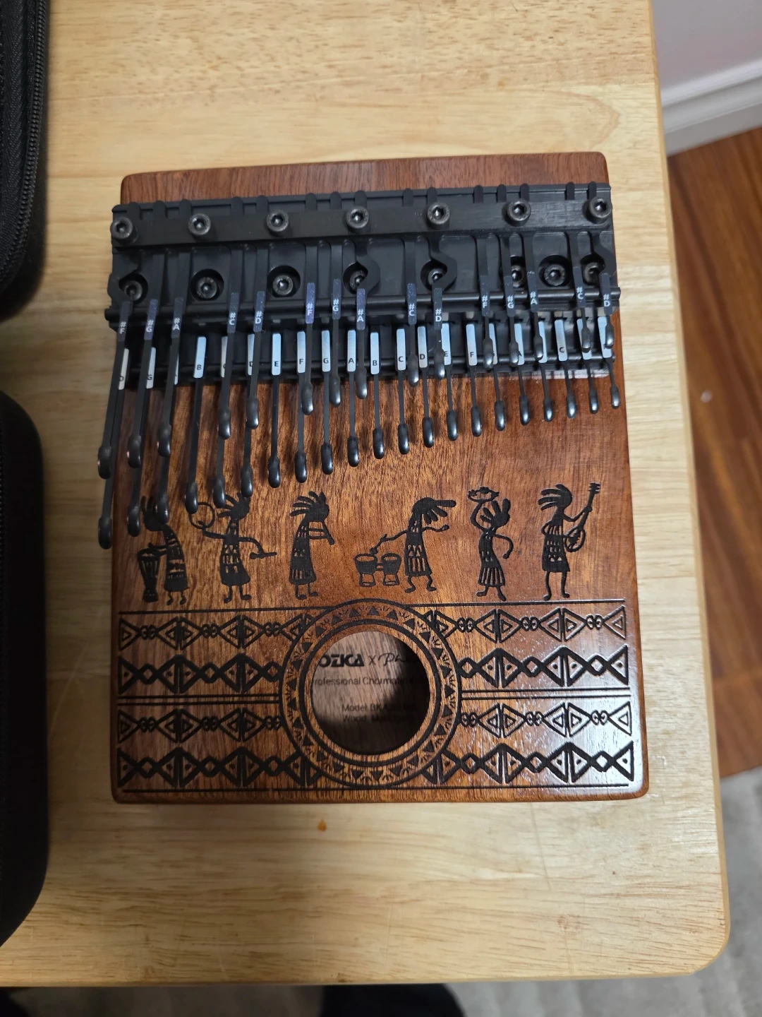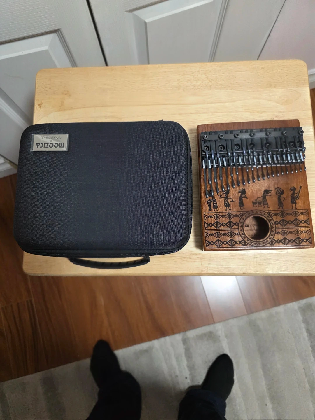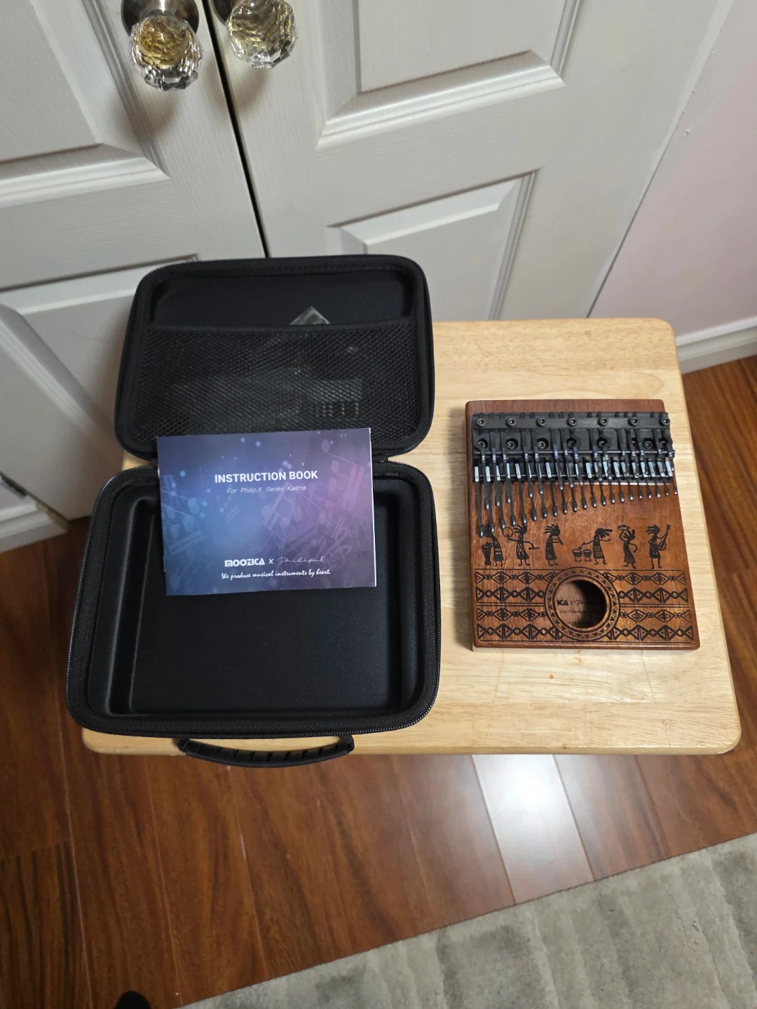 MOOZIKA Professional Kalimba in excellent condition. It's made from solid wood and features intricate engraved designs. Comes with its original carrying case and instruction book. This kalimba produces beautiful music!