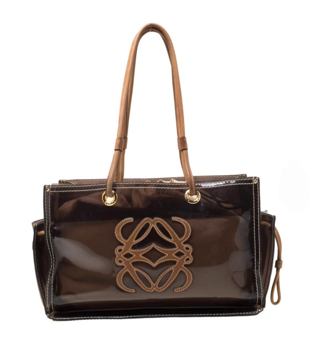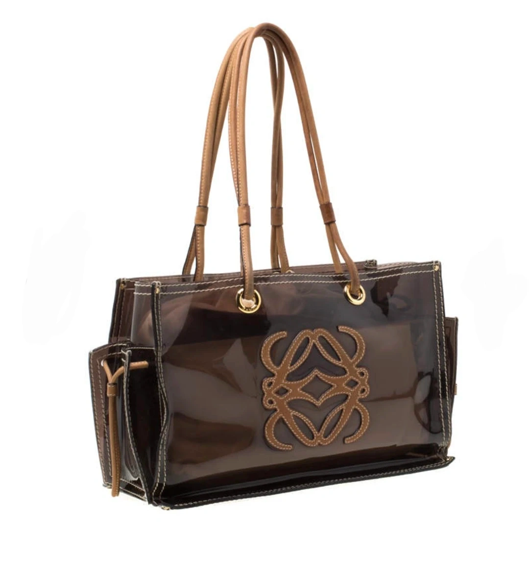This Loewe tote bag is crafted from a brown transparent Pvc material with leather trim. It features the iconic Anagram logo prominently displayed. Leather handles with gold-tone hardware complete the look.