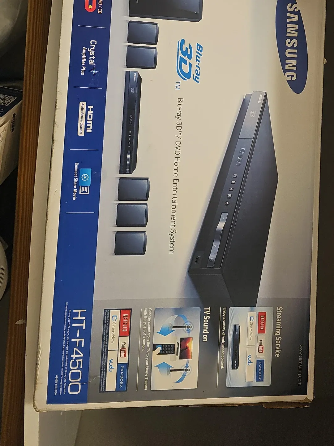 This is a Samsung HT-F4500 Blu-ray 3D Home Entertainment System. It features Crystal Amplifier Plus and HDMI Audio Return Channel. The system also includes streaming services like Netflix and YouTube.