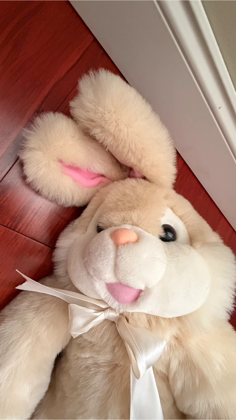 This is a large, soft plush eater bunny toy. It's a tan colour with pink paw pads and an inner ear lining. A satin ribbon is tied into a bow around its neck. The plush material is fuzzy and cuddly.