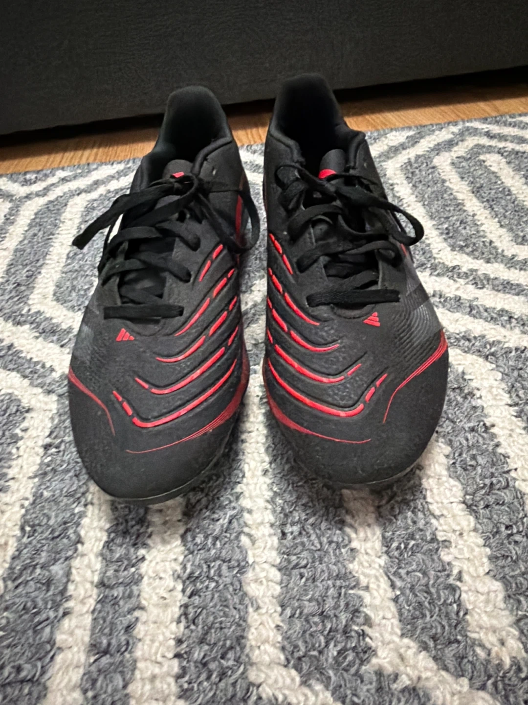 These black Adidas Predator soccer cleats feature red accents. They're designed for the pitch with firm ground studs. Used for playing soccer.