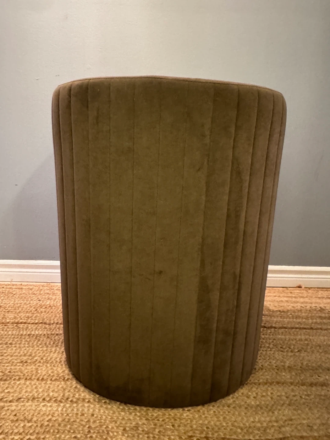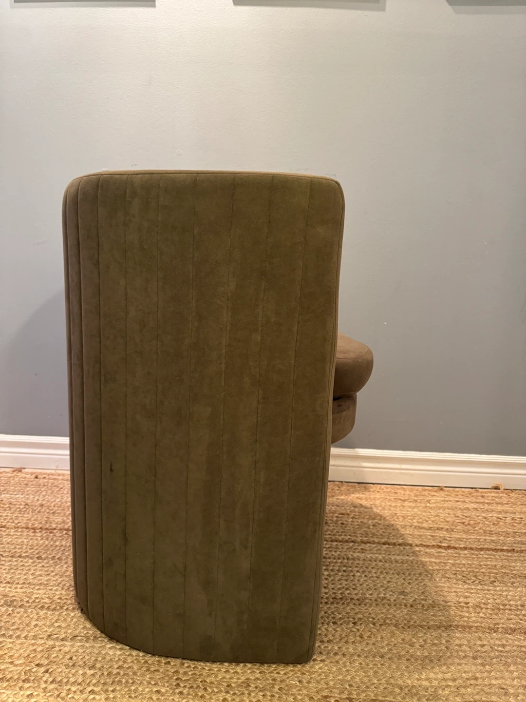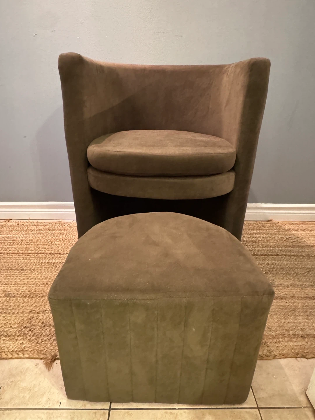 A stylish accent chair and ottoman upholstered in soft olive green velvet fabric. It features a channel tufted design on the backrest and a comfortable round seat. This chair adds a modern touch to any room.