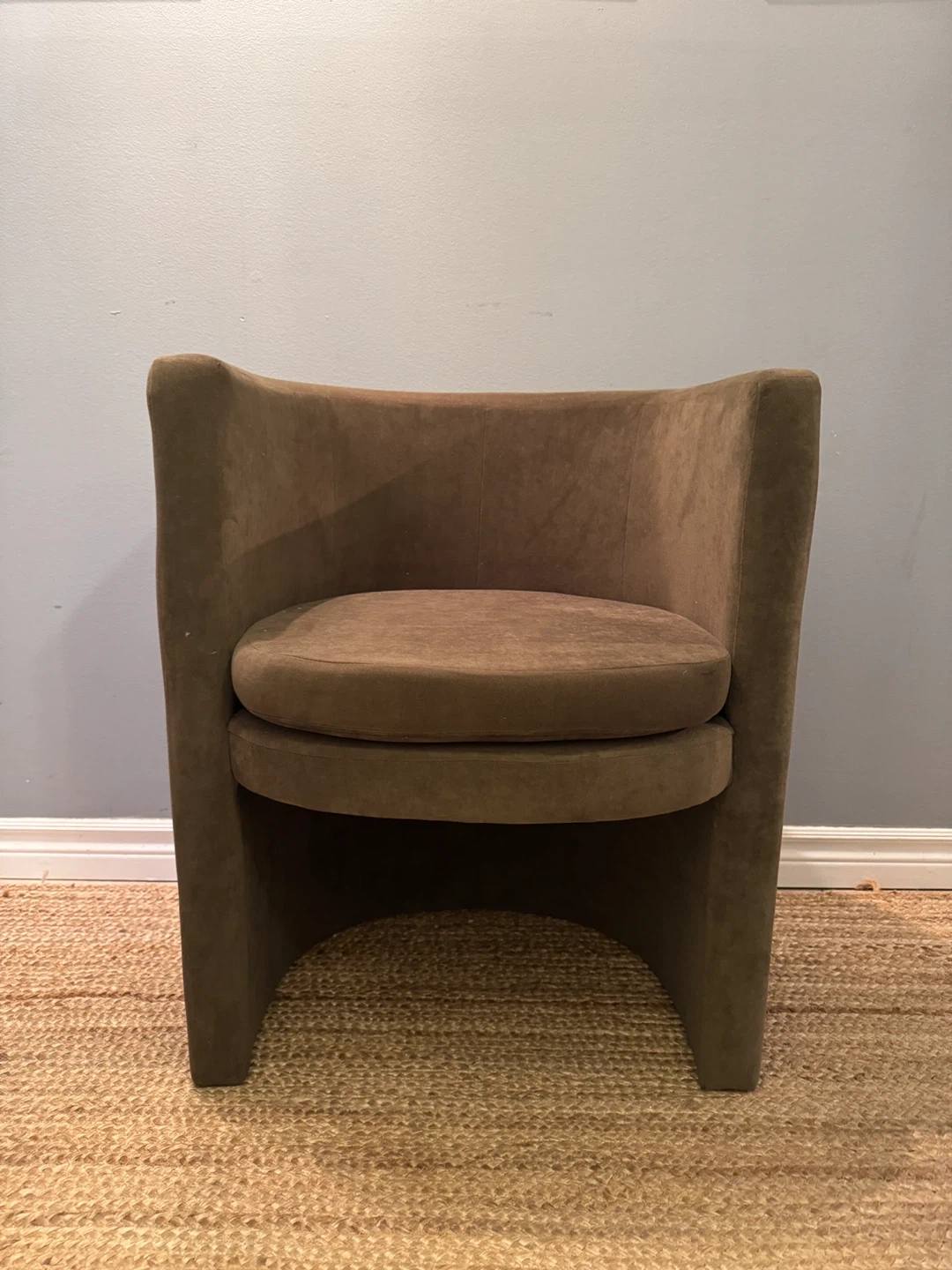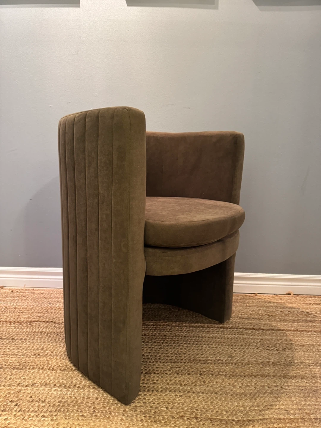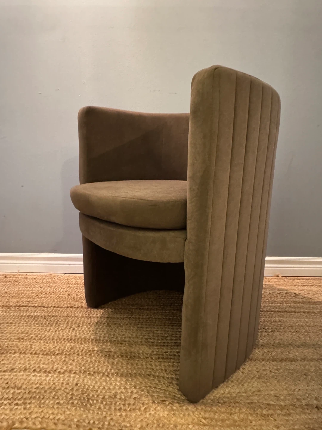 A stylish accent chair and ottoman upholstered in soft olive green velvet fabric. It features a channel tufted design on the backrest and a comfortable round seat. This chair adds a modern touch to any room.