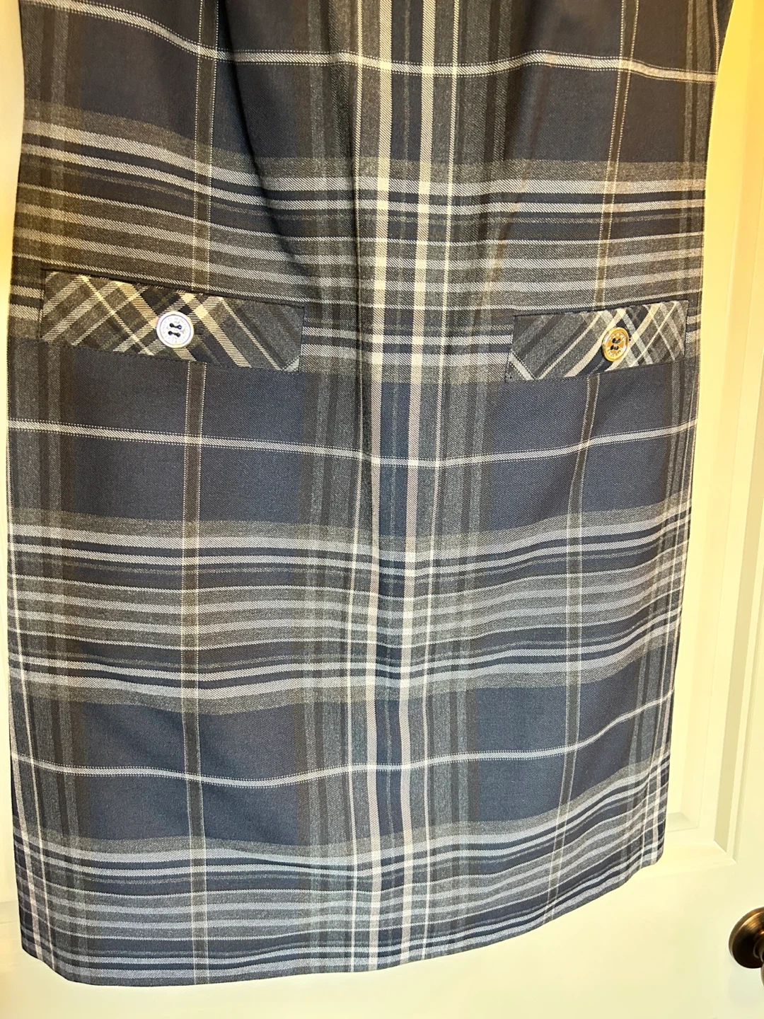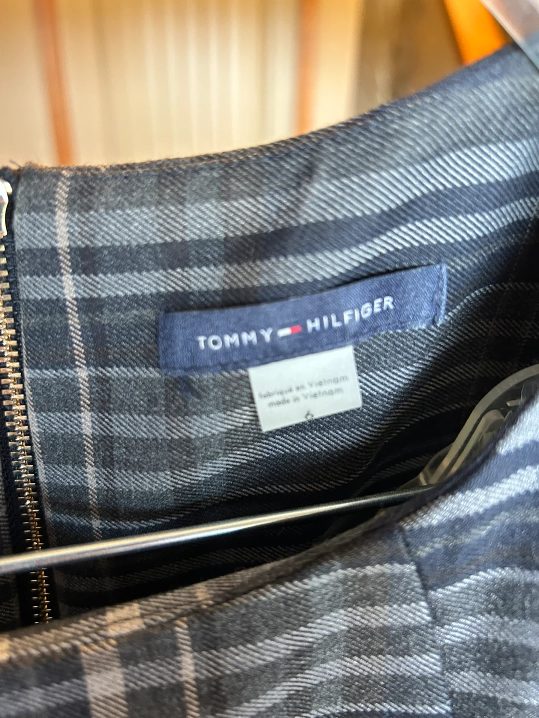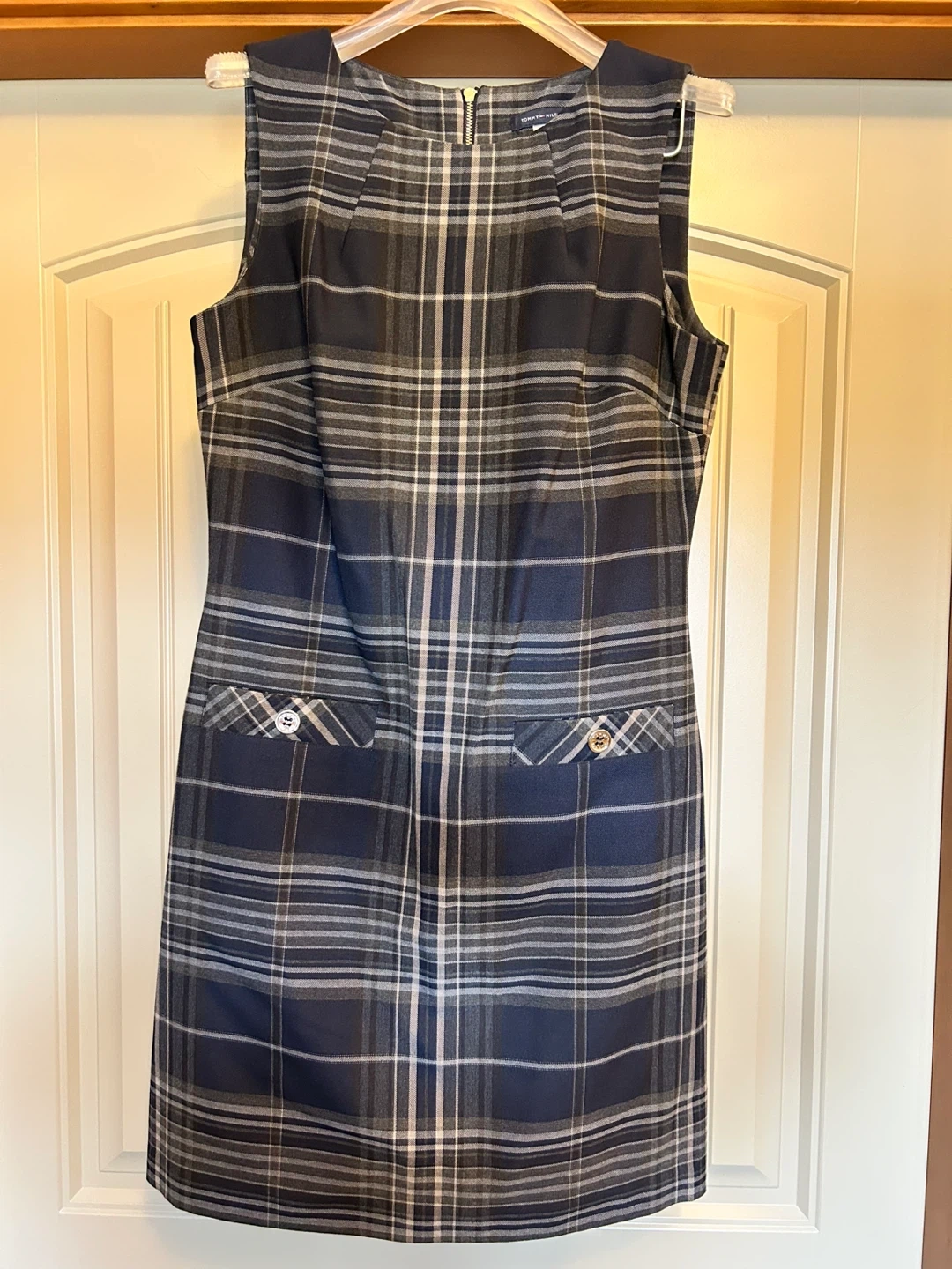 This Tommy Hilfiger sleeveless dress features a classic plaid pattern. It has a back zipper closure and decorative pocket flaps with buttons. A stylish option for any occasion! Size 6.