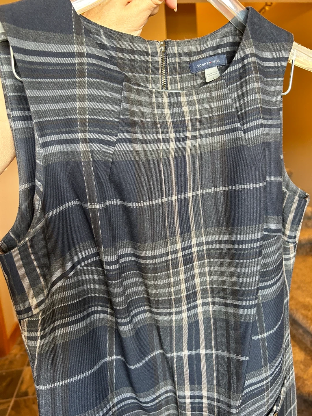 This Tommy Hilfiger sleeveless dress features a classic plaid pattern. It has a back zipper closure and decorative pocket flaps with buttons. A stylish option for any occasion! Size 6.