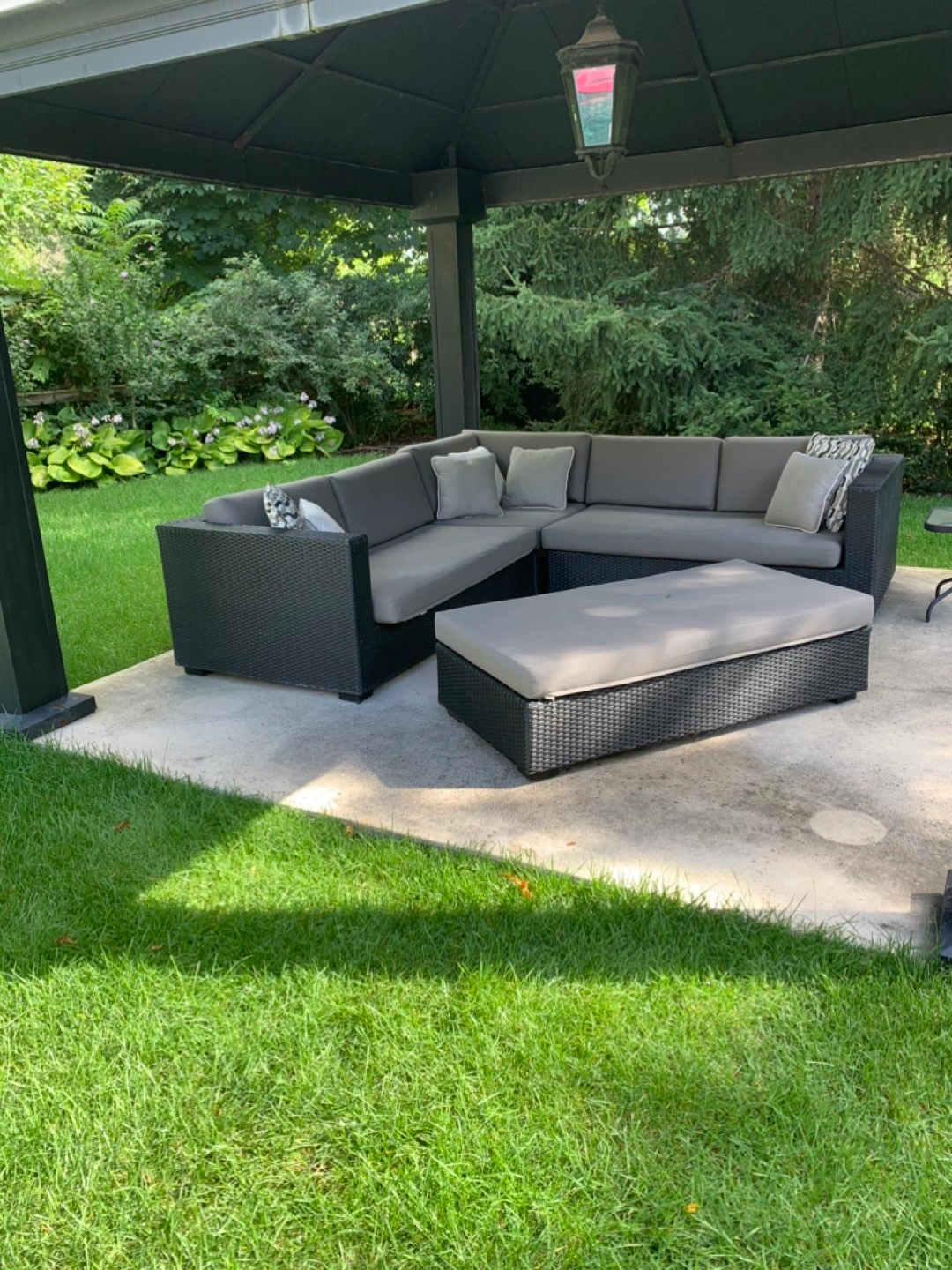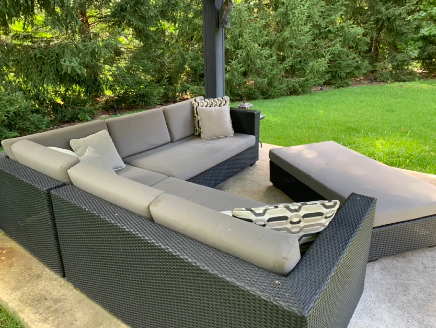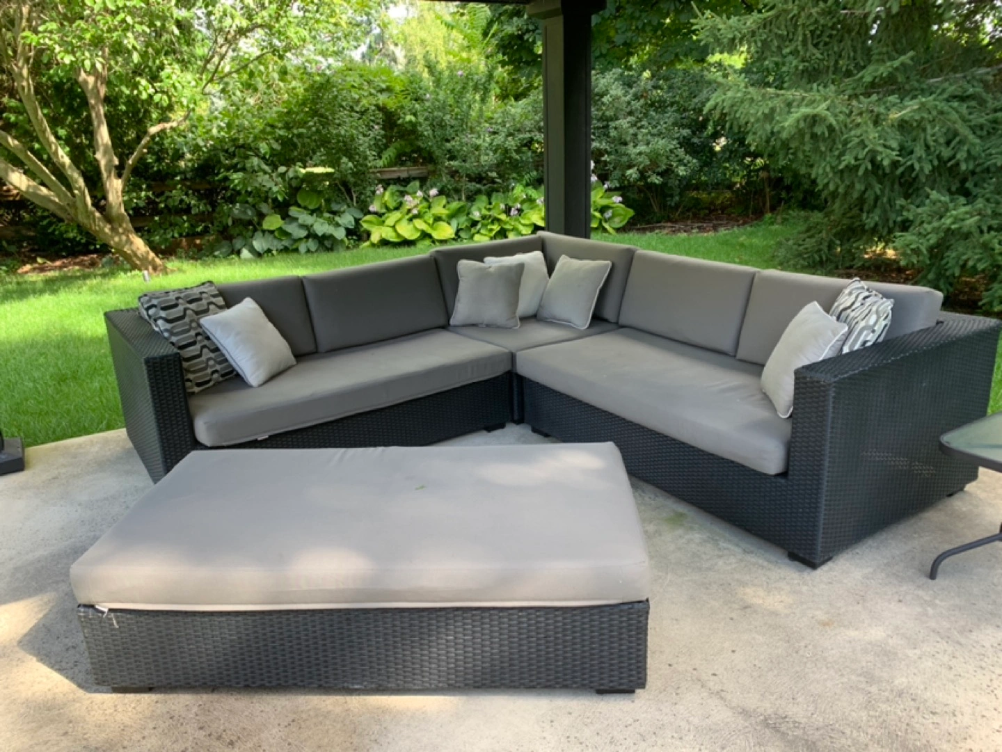 Each sofa is 100 x 28 x 36” high. Grey fabric, dark grey vinyl rattan. 7 throw cushions. Large ottoman 28 x 56 x 16” high. Priced to go quickly.