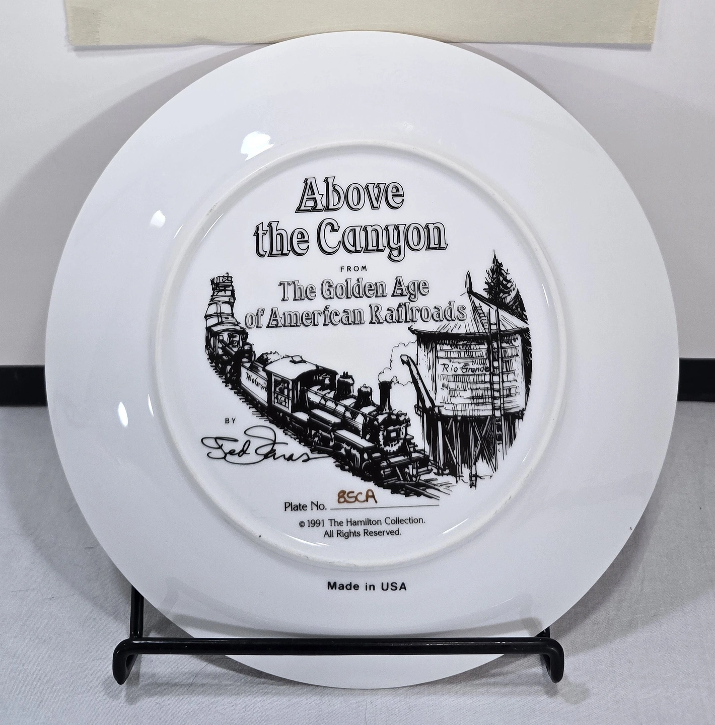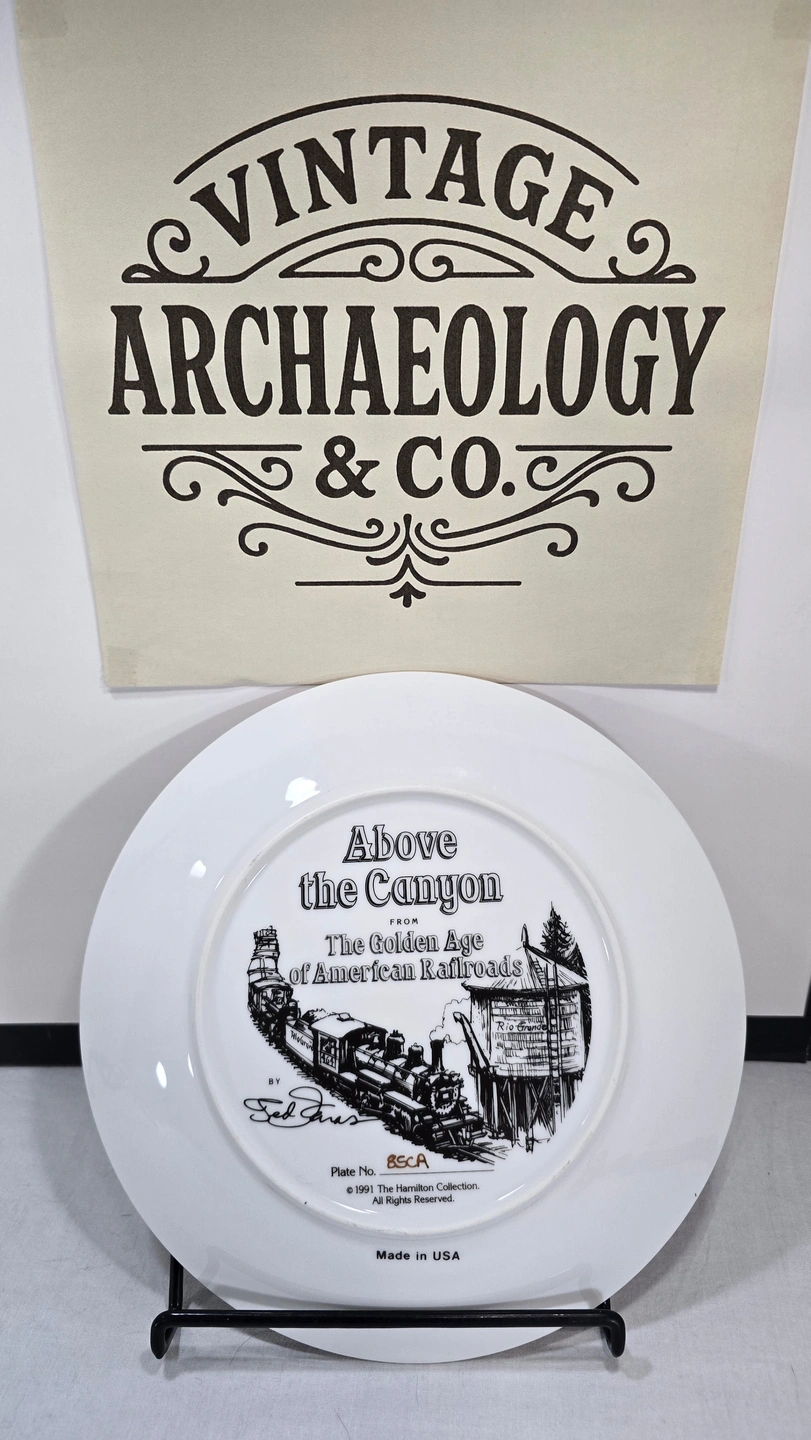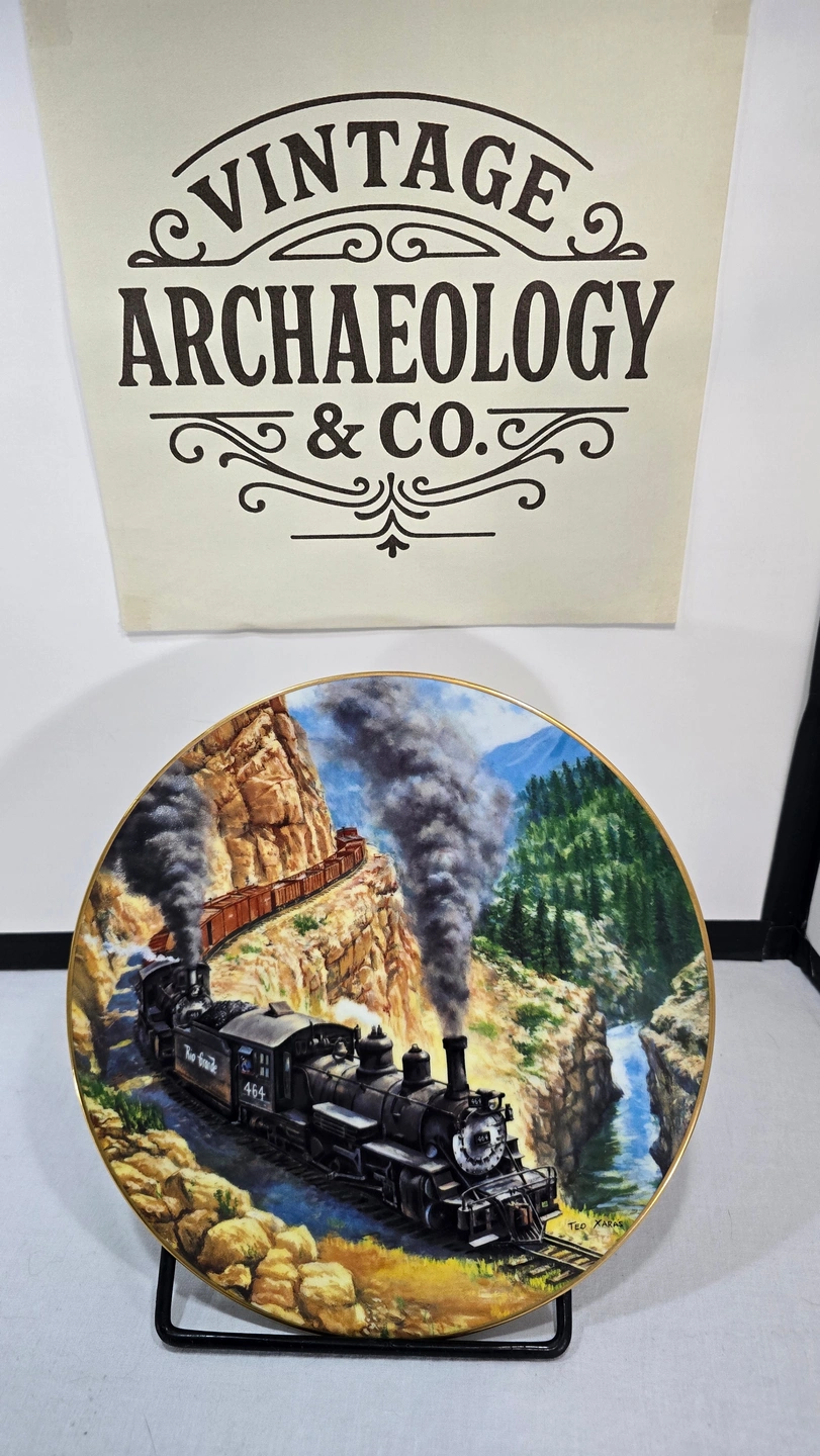 This collector plate was issued by The Hamilton Collection in the early 1990s as part of The Golden Age of American Railroads series. The series commemorated the romantic era of steam locomotives in the American West, featuring detailed artwork by Ted Xaras.