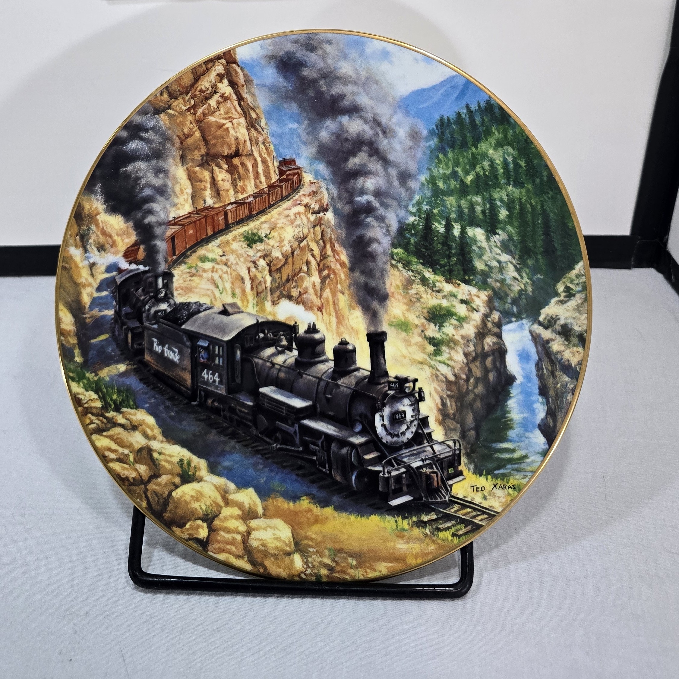 This collector plate was issued by The Hamilton Collection in the early 1990s as part of The Golden Age of American Railroads series. The series commemorated the romantic era of steam locomotives in the American West, featuring detailed artwork by Ted Xaras.