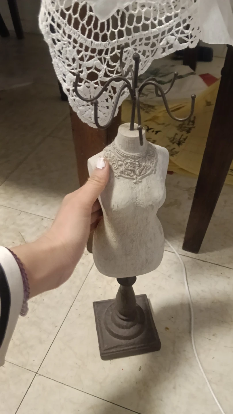 This is a vintage-style mannequin torso jewelry holder. It's great for displaying necklaces and bracelets. The base is dark metal, and the torso is a distressed light grey.