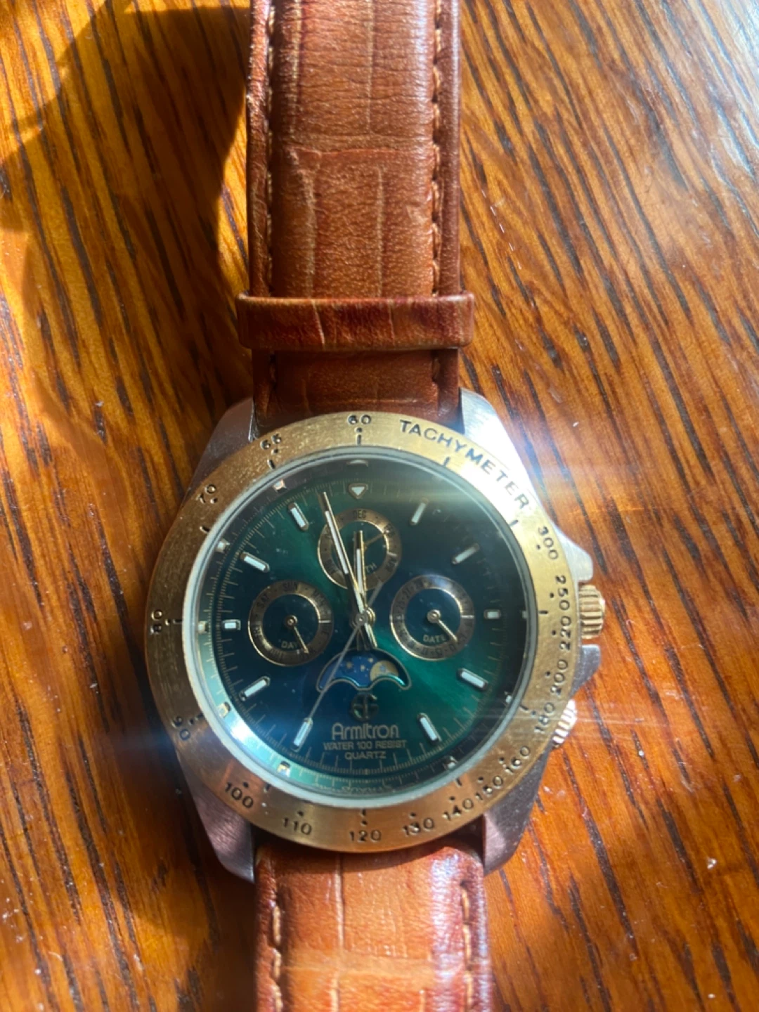 Selling an Armitron watch with a brown leather strap. It features a green face with gold accents. The watch has chronograph subdials and a tachymeter bezel. It's water resistant to 100 feet