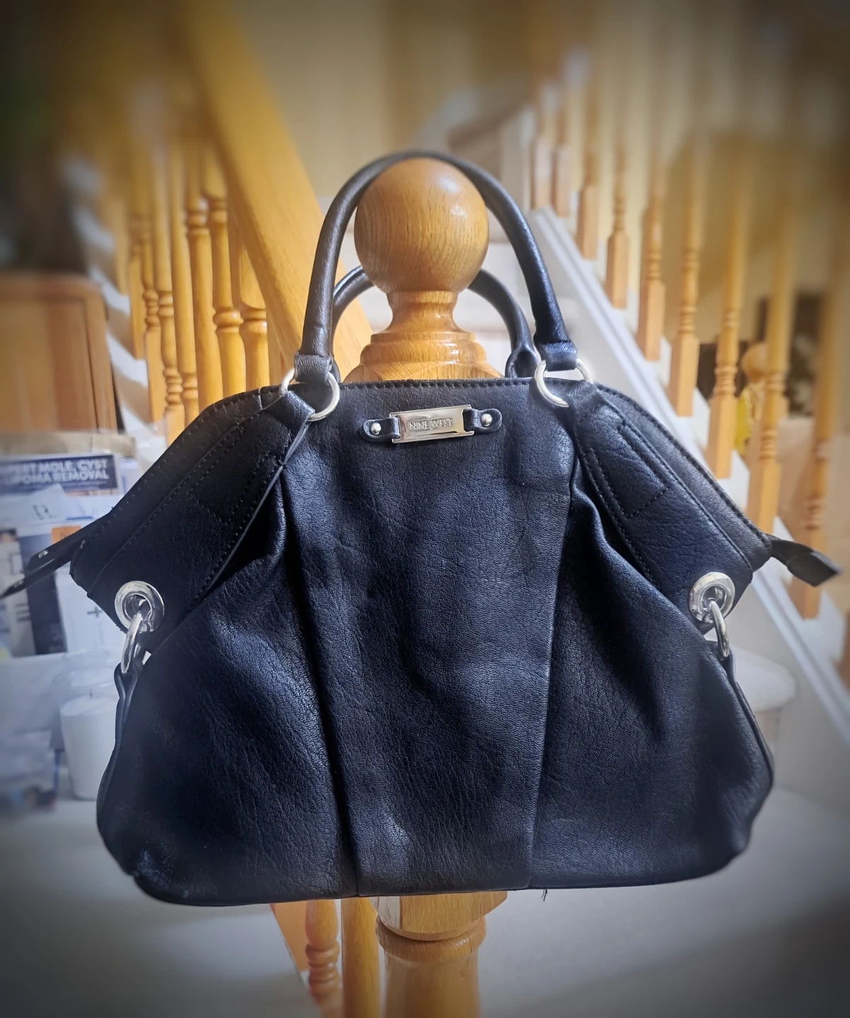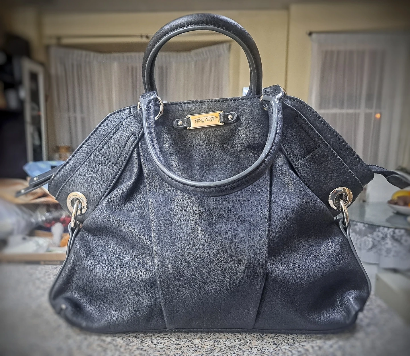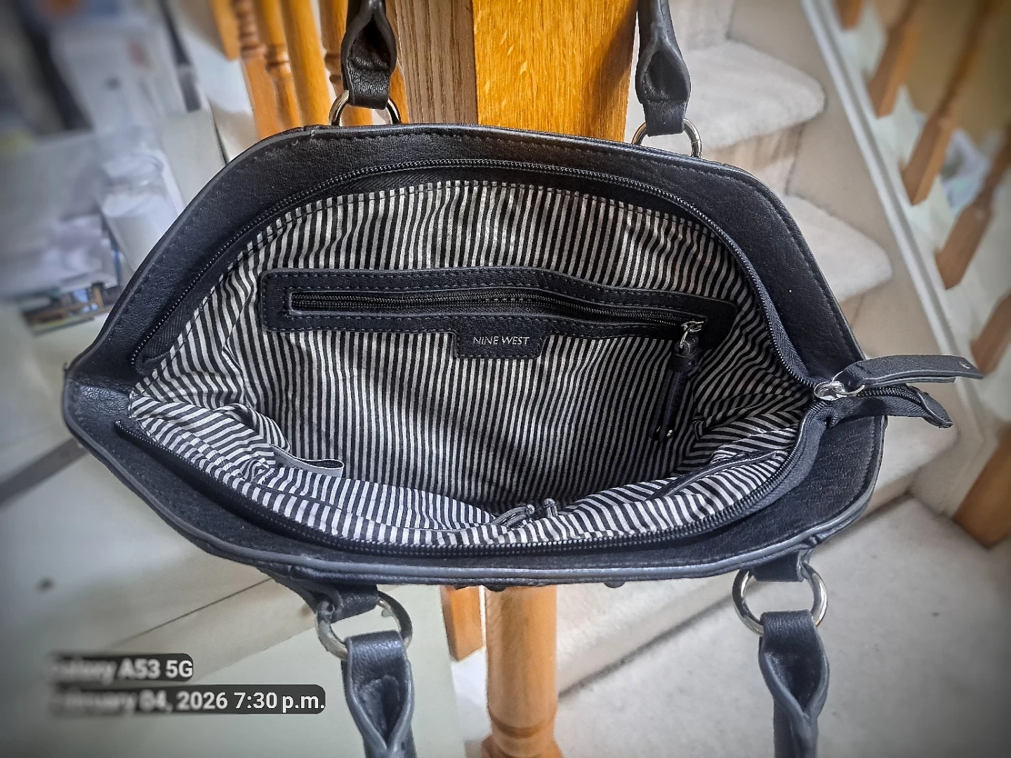 This Nine West handbag is black with a faux leather exterior. It features a striped interior lining and a zip pocket. It's a classic everyday purse for essentials.