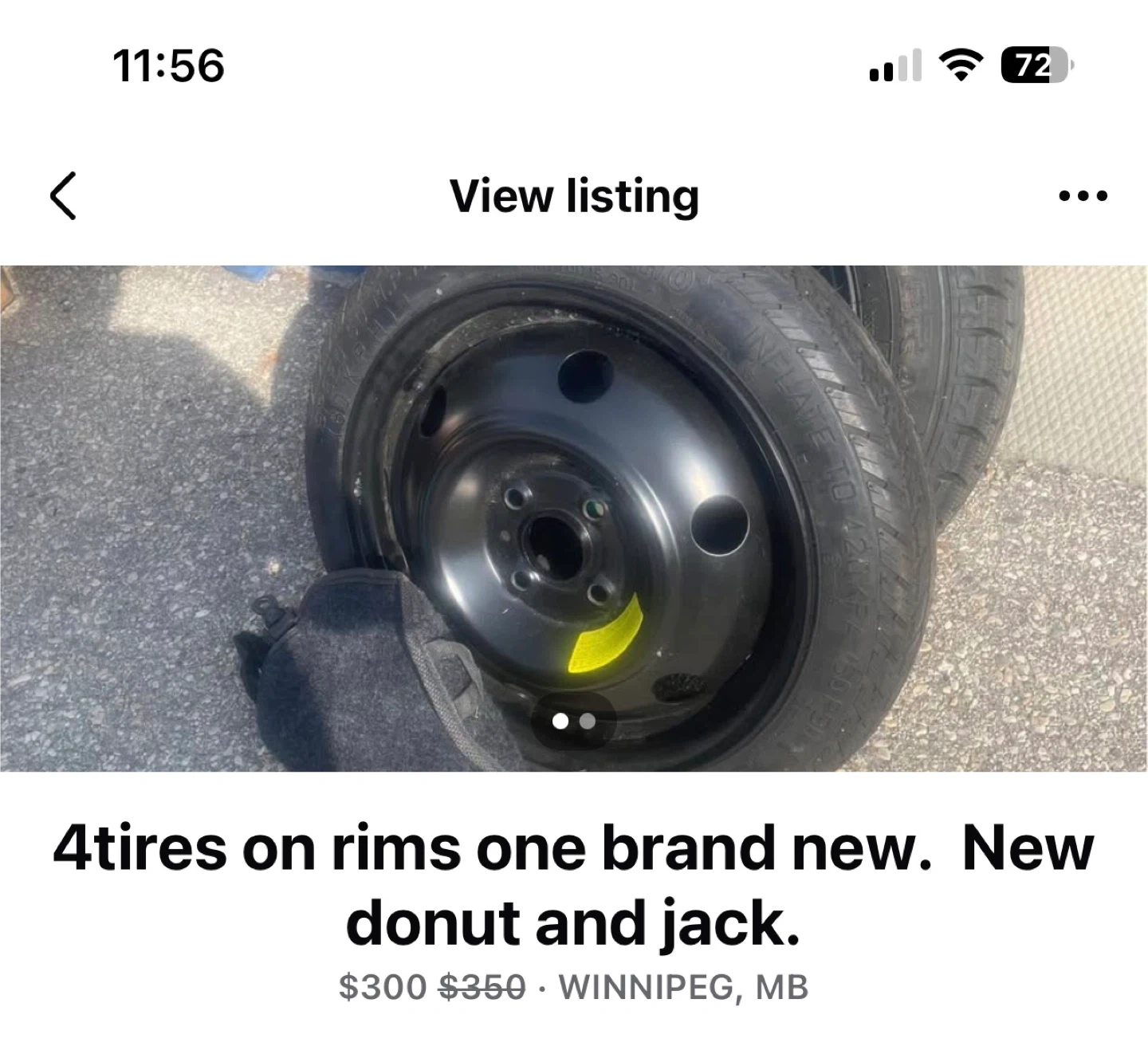 Four tires are on rims and one is a brand new donut spare tire. A jack is also included. This set is perfect for emergency roadside situations. Size in pic
