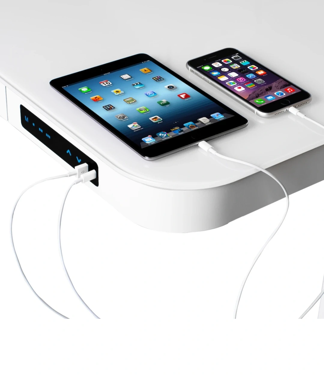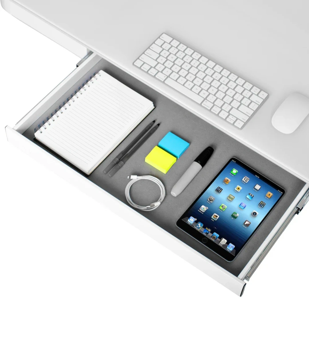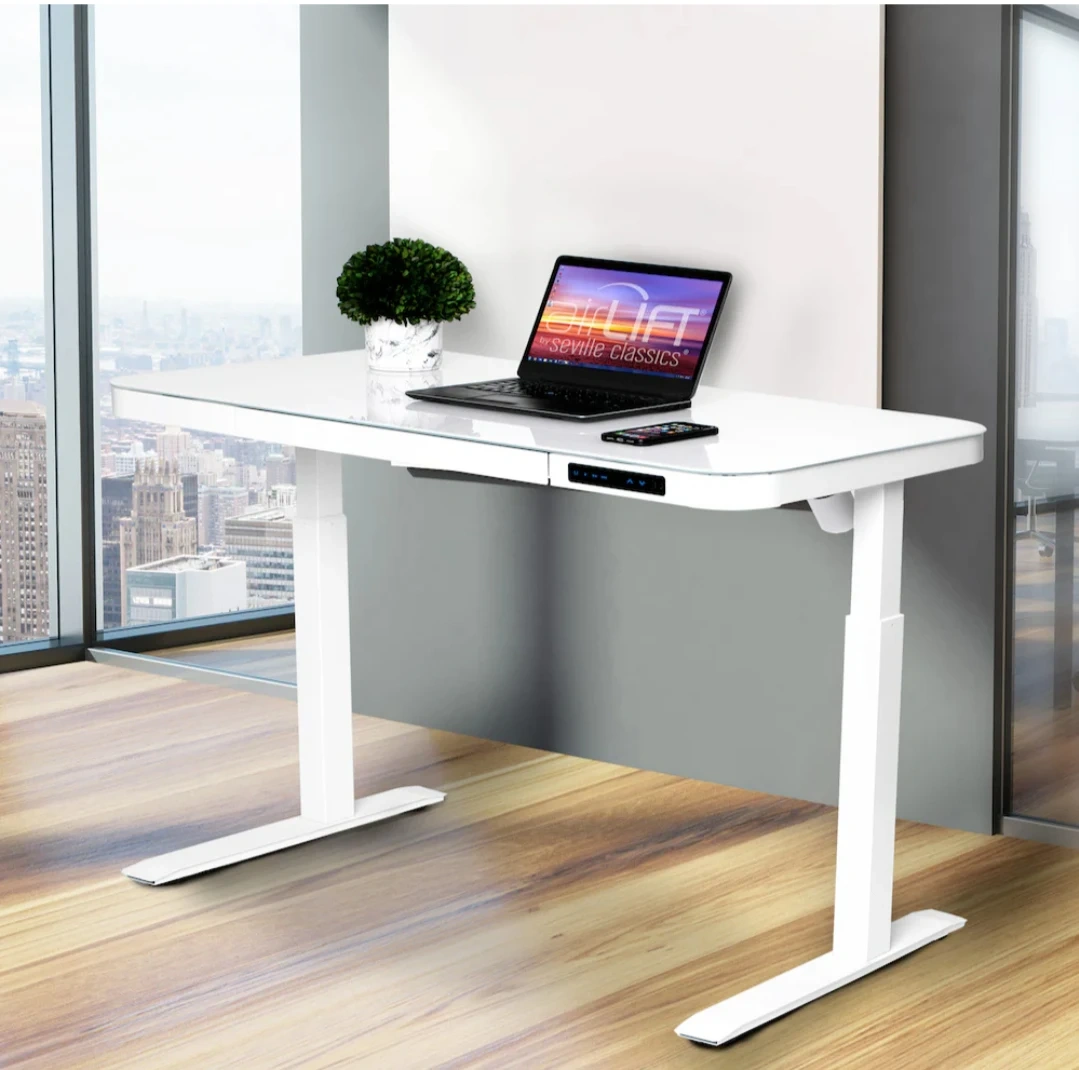 Electric sit-stand desk with white tempered glass top. It has a spacious surface and a built-in drawer for storage. Adjusts from 27" to 46" high. Great for versatile workspaces!