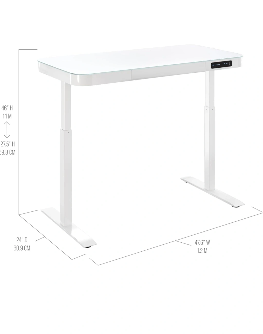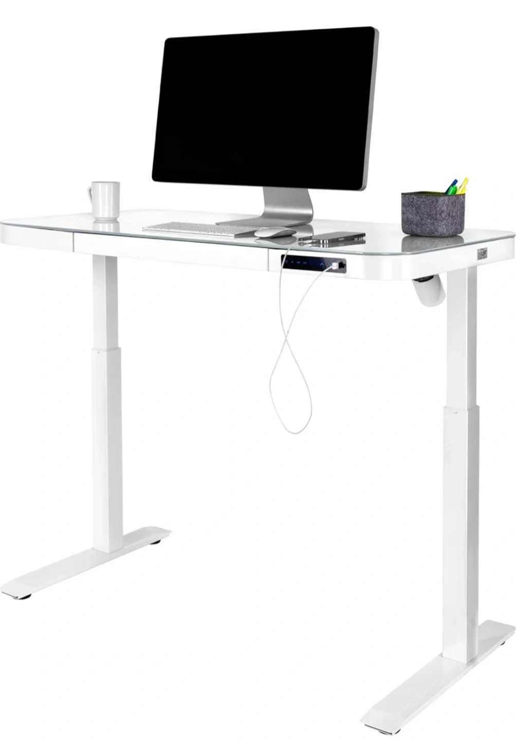 Electric sit-stand desk with white tempered glass top. It has a spacious surface and a built-in drawer for storage. Adjusts from 27" to 46" high. Great for versatile workspaces!