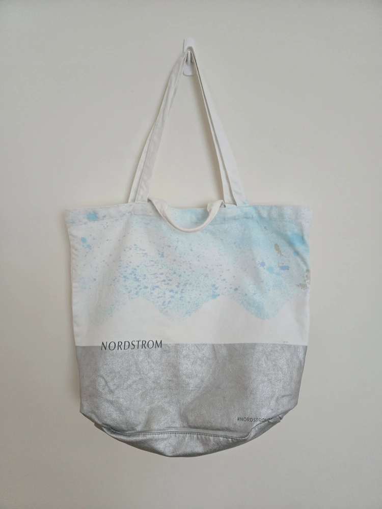 Discontinued Nordstrom TO tote bag! It features a two-tone design with a white upper and a silver lower section. Perfect for carrying your essentials while adding a touch of elegance to your look