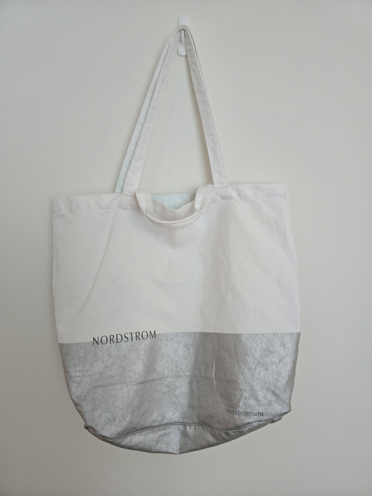Discontinued Nordstrom TO tote bag! It features a two-tone design with a white upper and a silver lower section. Perfect for carrying your essentials while adding a touch of elegance to your look