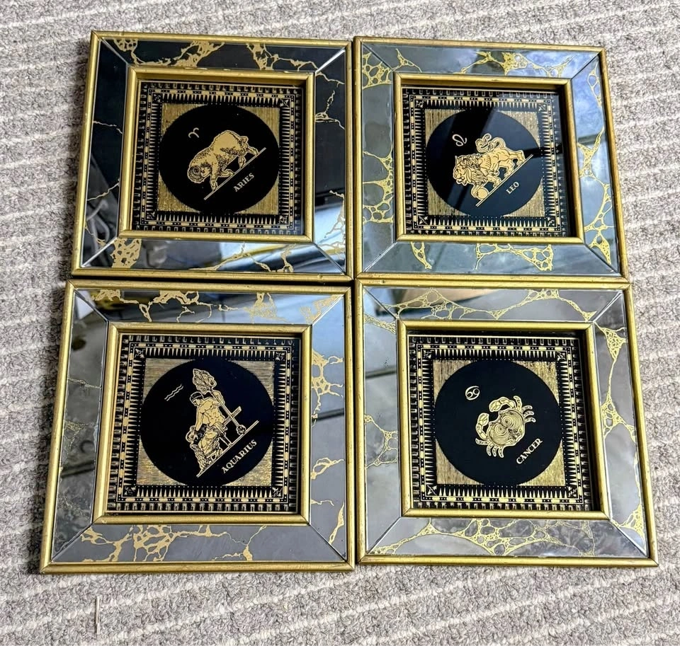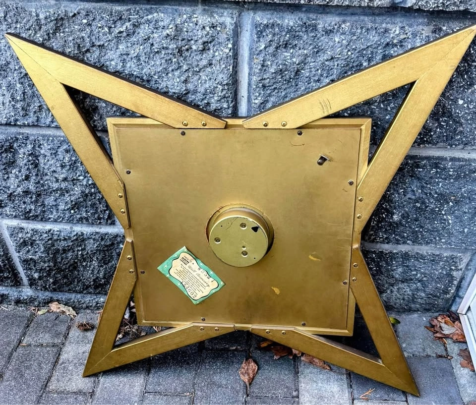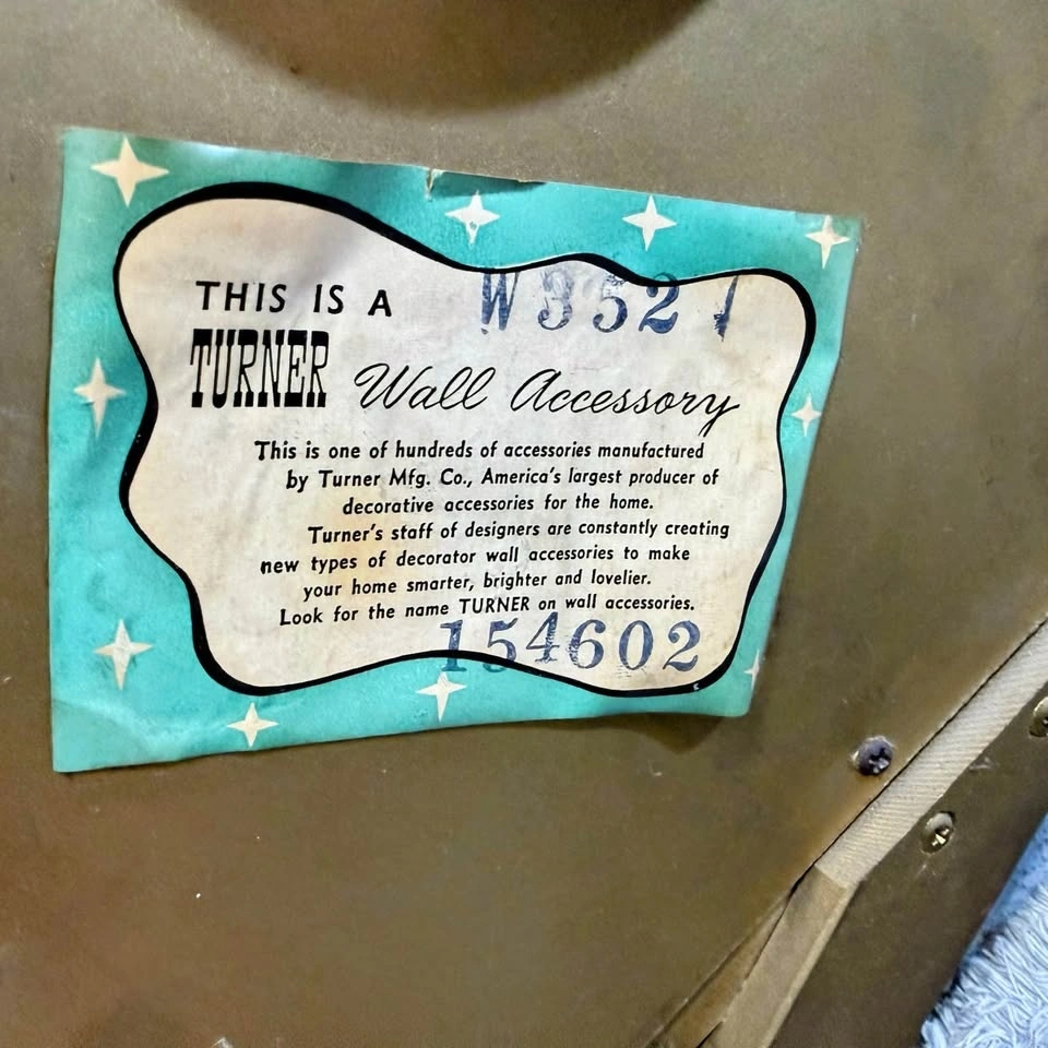 Original Turner Mfg. Co. wall clock with the classic mid-century starburst design. Gold and mirrored glass construction with Roman numeral face — strong presence and looks excellent on the wall. Authentic Turner Wall Accessory. Circa 1950s–early 1960s. Original Turner winding key included. Fully working. Glass in good condition — no cracks. Minor wear and tear consistent with age. Well-made vintage piece and getting harder to find complete and working. Also comes with Four Zodiac signs & Key.Local Pickup only,Yonkers 10704