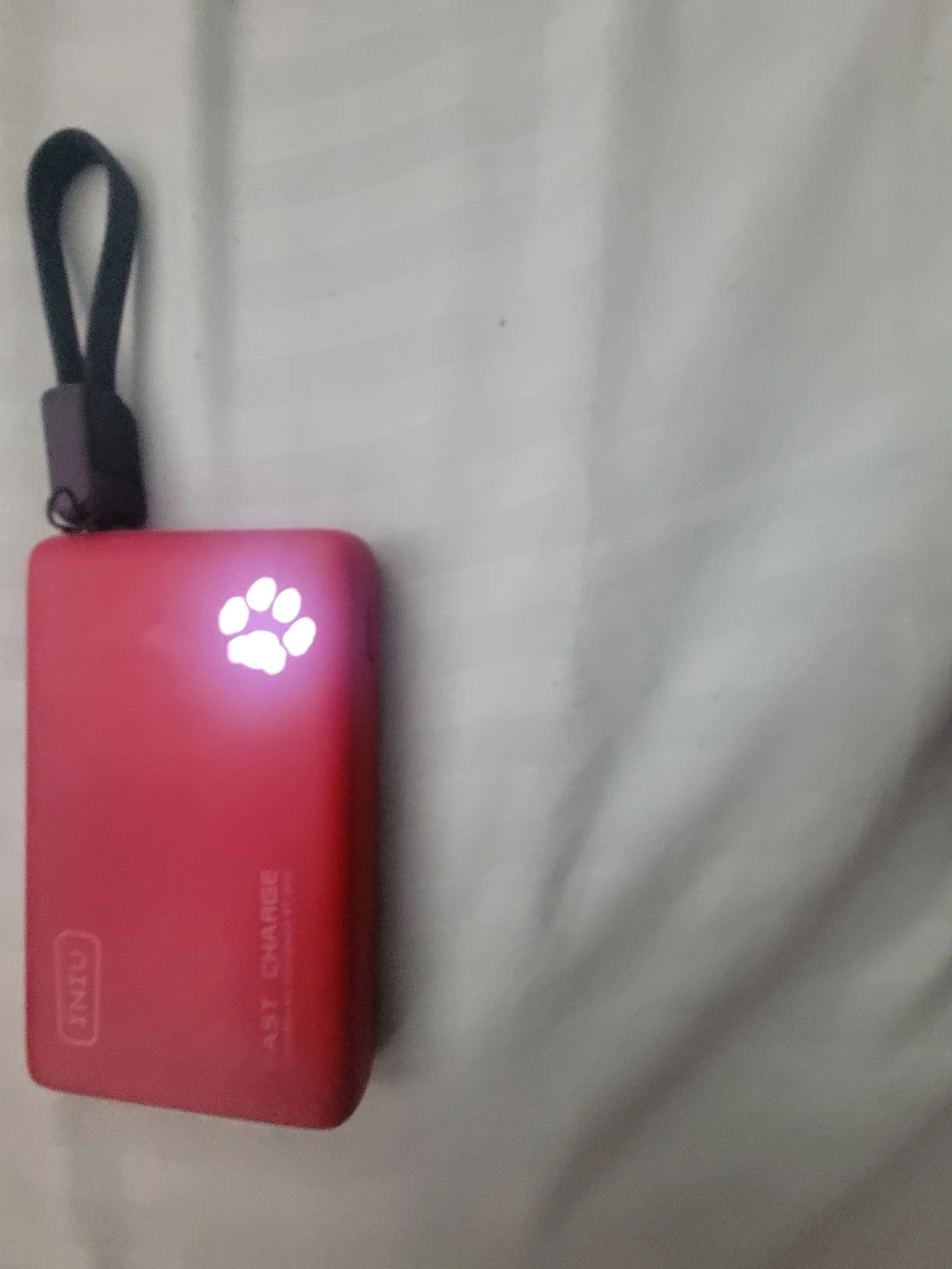 Selling a red INIU power bank! It has a cute paw print design and a handy wrist strap. Perfect for charging your devices on the go