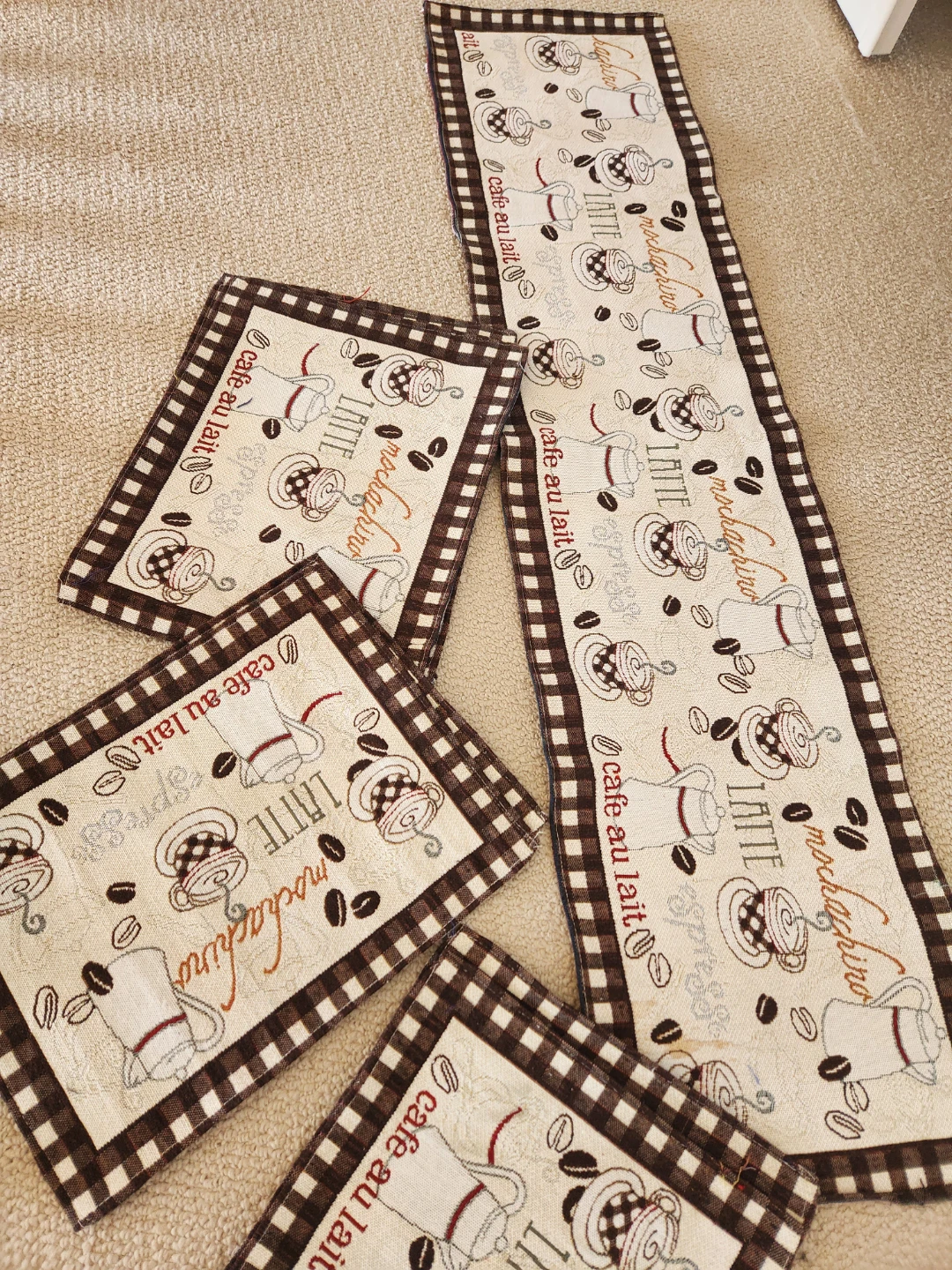 Set of Table runner and 6 placemats featuring a coffee theme with 'café au lait', 'latte', and 'espresso' text.