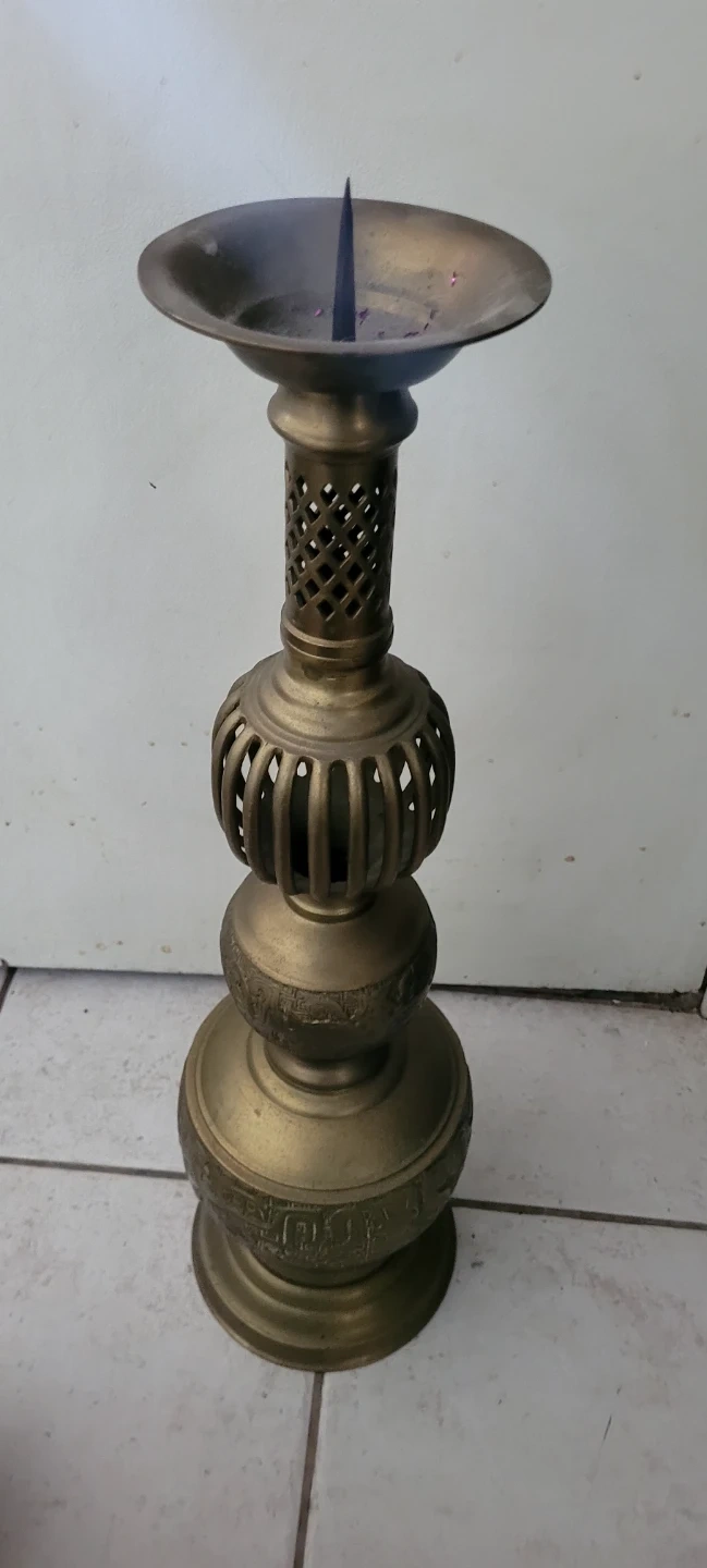 This is a 1 of 2 vintage decorative candlestick holders with an ornate design. It's made of brass and has a distressed finish. The holder features intricate carvings and lattice work. It's perfect for adding a vintage touch to your home decor.