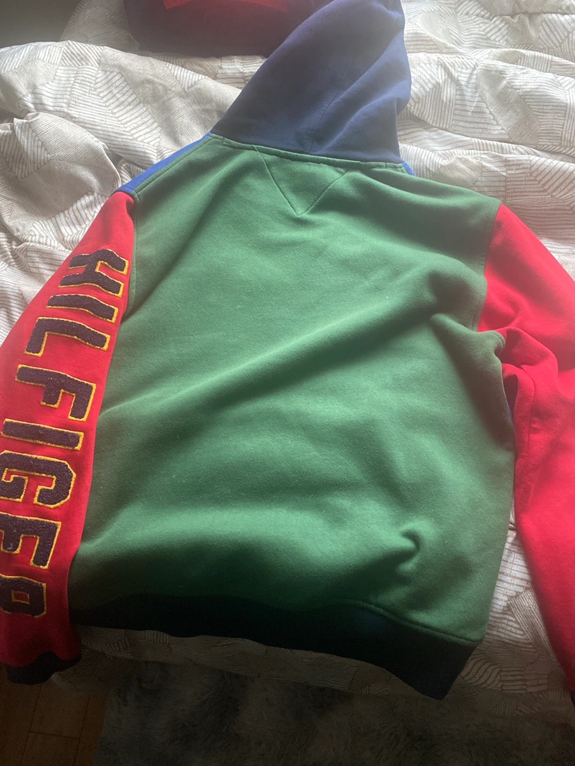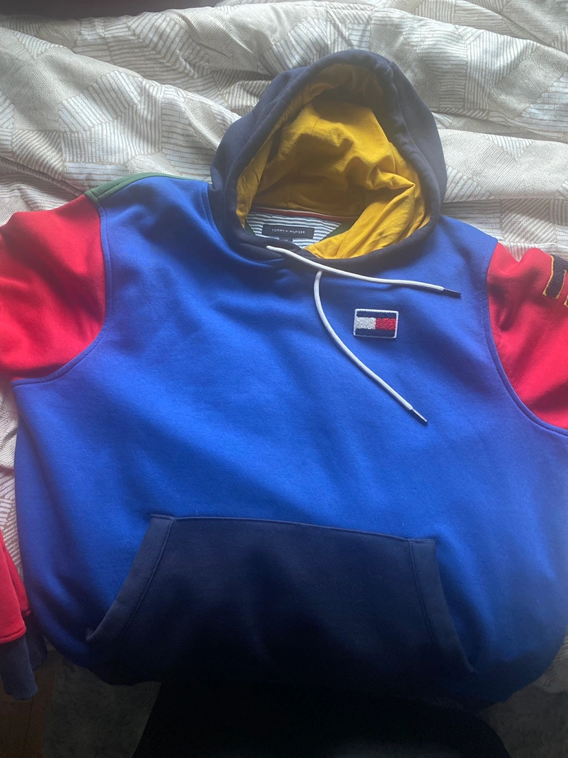 Men's size Large colour block hoodie with a Tommy Hilfiger logo on the front. The hoodie has a blue, green, red, and yellow colour scheme. It has a pouch pocket on the front and a hood with drawstrings. The sleeves are long and have a Tommy Hilfiger logo on the left sleeve. The back of the hoodie is a solid green colour with a Tommy Hilfiger logo on the right shoulder. It is in a n excellent condition.