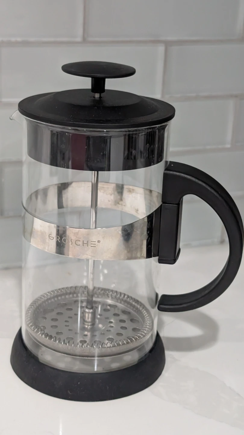 This is a clear glass French press with a black handle and lid. It has a stainless steel filter and frame. Making coffee or tea is simple with this press!