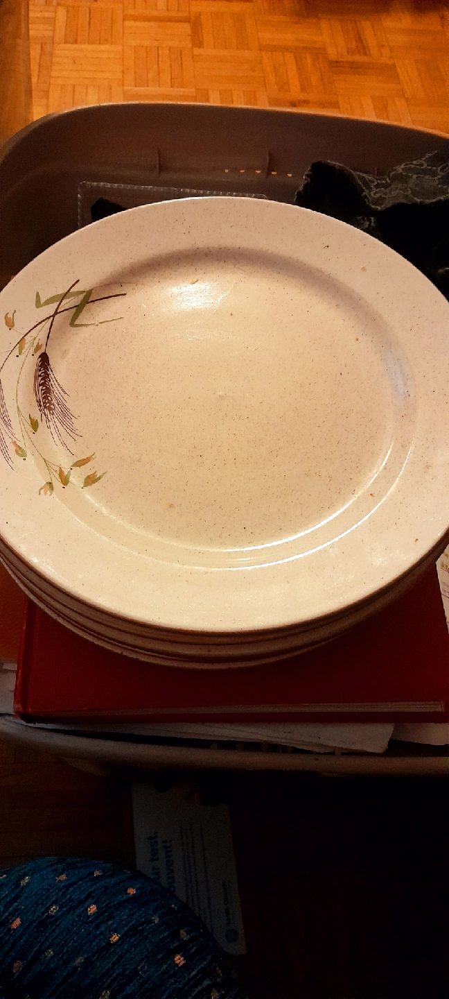 Selling a set of vintage Harmony House dinner plates. They have a lovely wheat design and a speckled finish. These plates would add a touch of retro charm to any table setting!