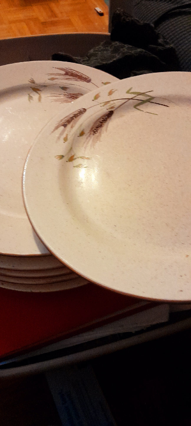 Selling a set of vintage Harmony House dinner plates. They have a lovely wheat design and a speckled finish. These plates would add a touch of retro charm to any table setting!