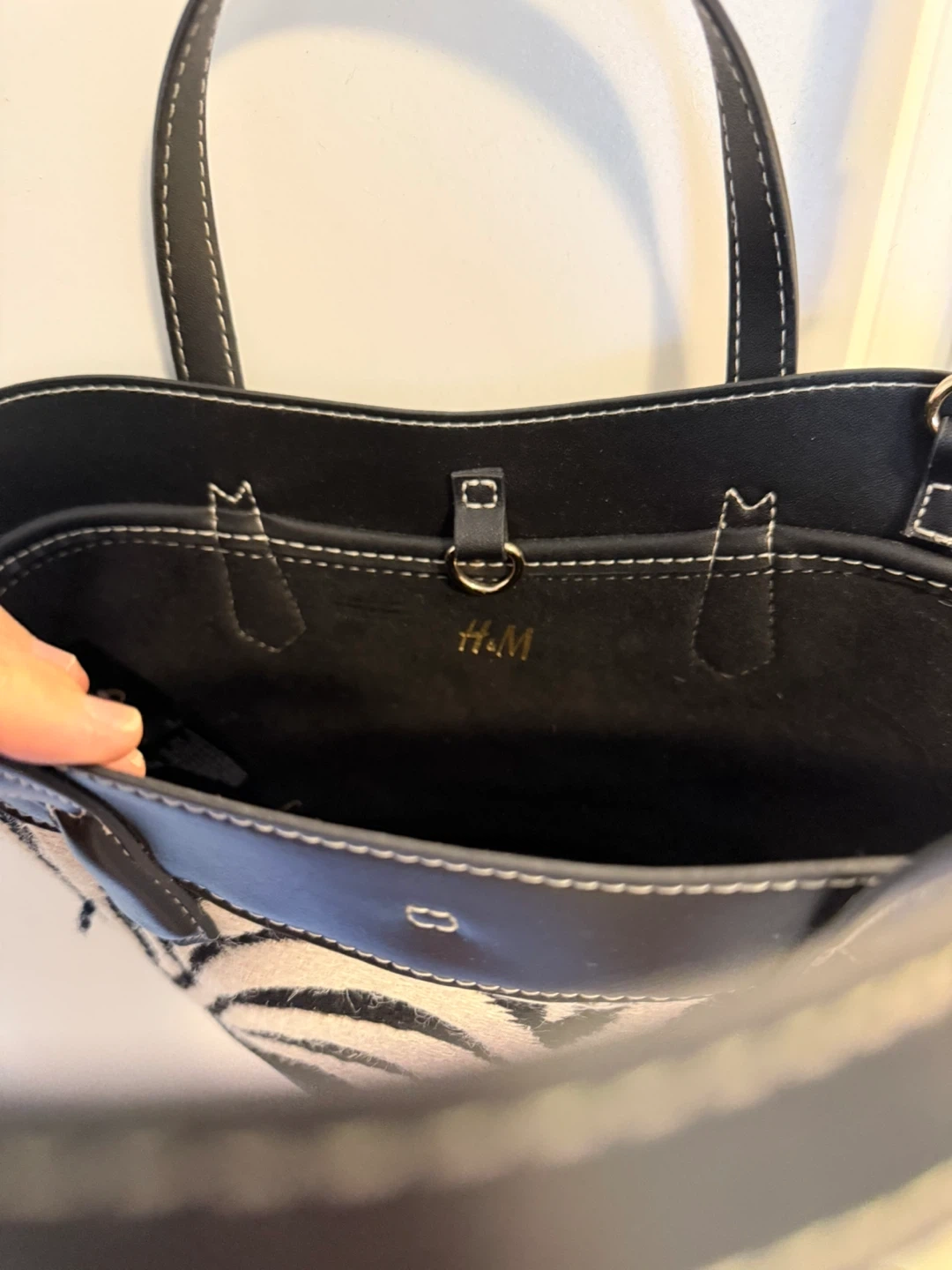 Stylish H&M tote bag with a black and white zebra print panel. It's made from faux leather with contrast stitching and has top handles and a removable shoulder strap. Inside, there's a small pocket.