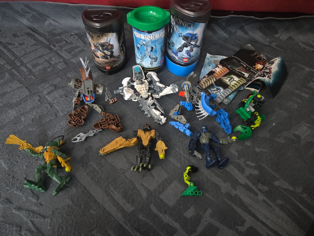 Collection of LEGO Bionicle figures and their original storage cups. Includes various assembled figures and loose parts. These are great for any LEGO Bionicle fan's collection!