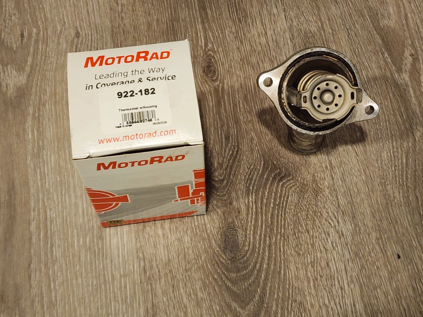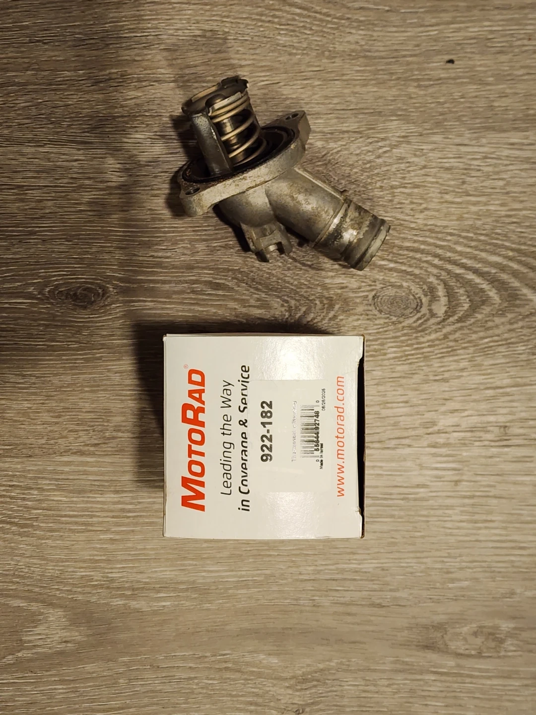 This is a MotoRad thermostat with housing, part number 922-182. It's made of metal and includes the original box. This part is essential for regulating engine temperature. This specific part is a direct replacement for various General Motors (GM) vehicles, including models from Chevrolet, GMC, Buick, and Cadillac. It is typically compatible with vehicles manufactured between 2013 and 2023 that use certain 4-cylinder engines (such as the 2.5L L4).