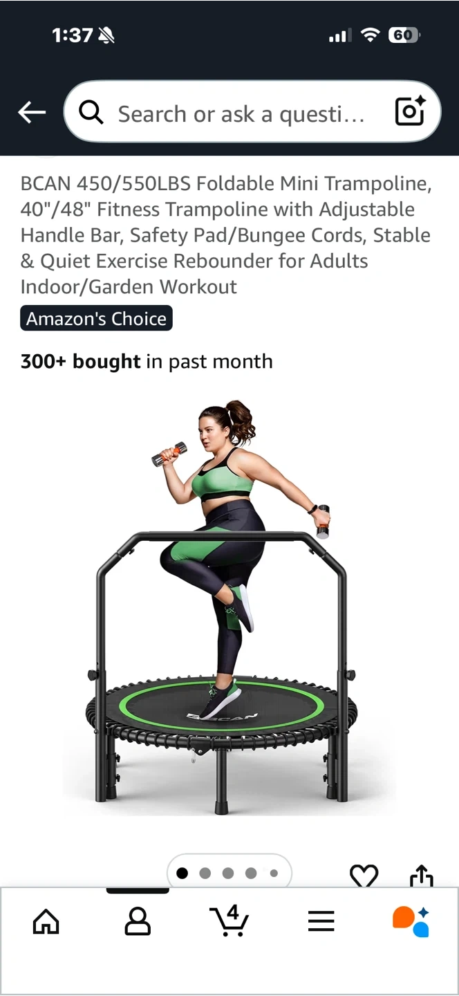 This BCAN fitness trampoline is foldable and features an adjustable handle bar and safety pad. It uses bungee cords for stable and quiet bouncing. It's suitable for indoor or garden workouts.