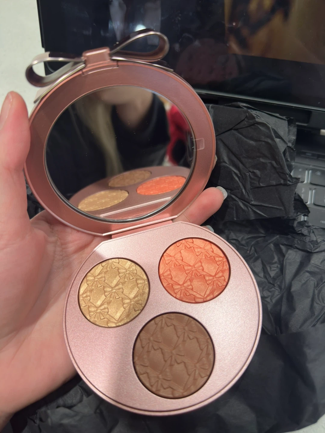 This MAC Effervescence Extra Dimension Face Compact comes in a medium shade. It includes a bronzer, blush, and highlighter. The compact features a rose gold finish with a bow detail.