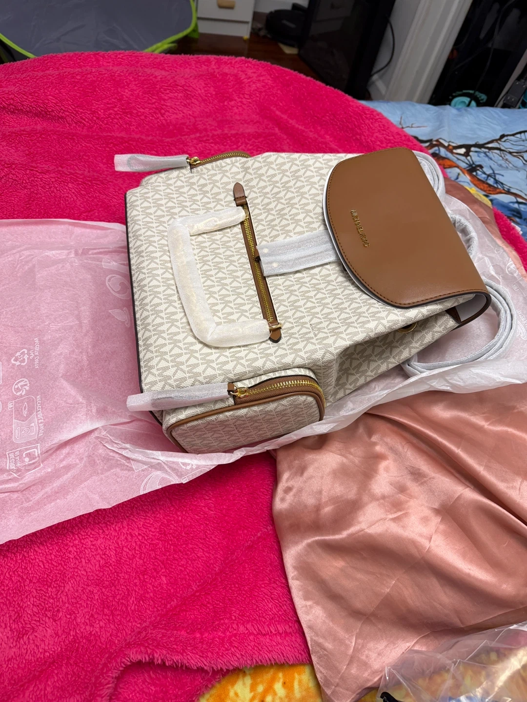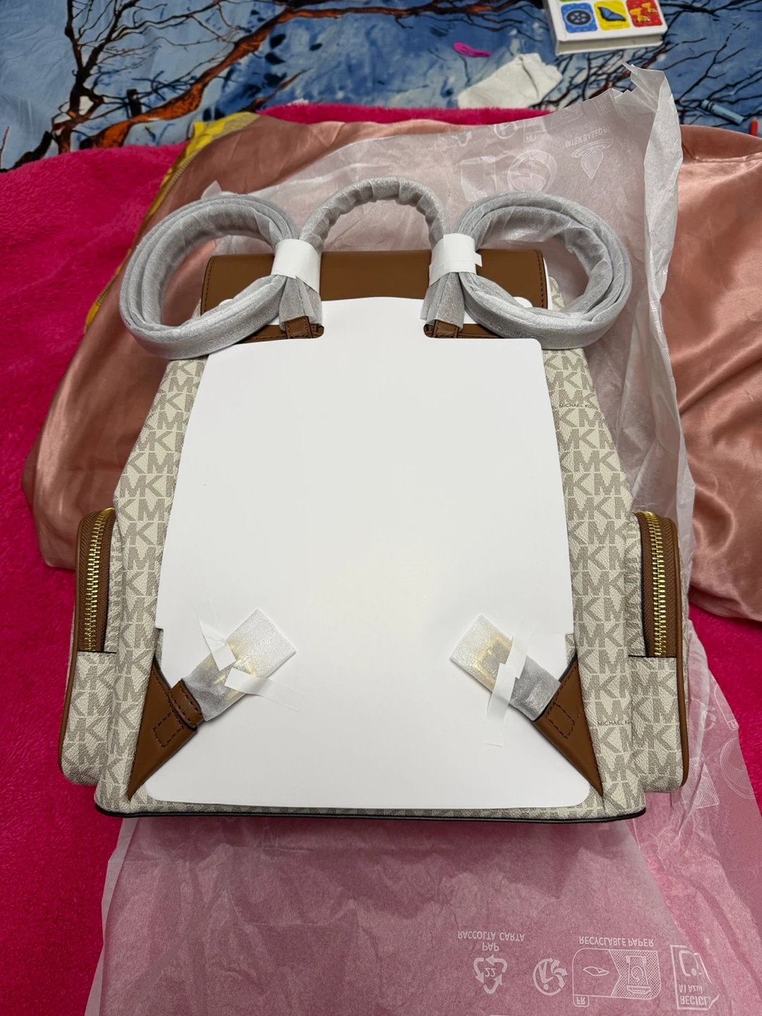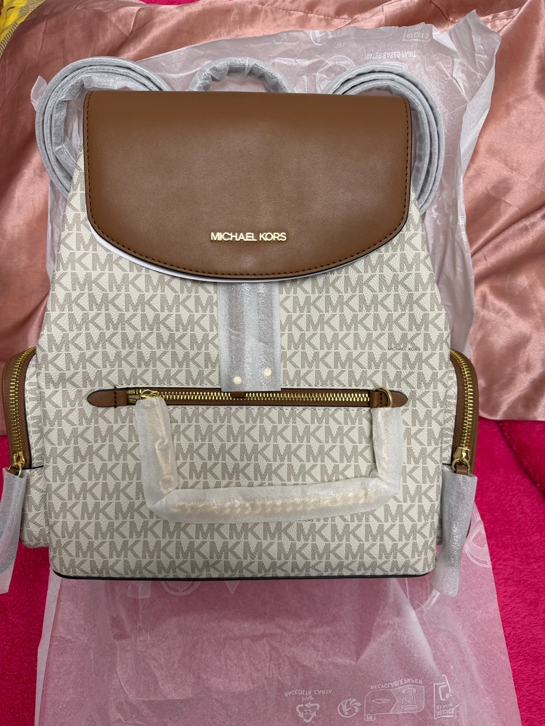 Brand new Michael Kors backpack. It's the signature MK pattern with brown leather accents and gold hardware. Features a front zip pocket and side zip pockets.