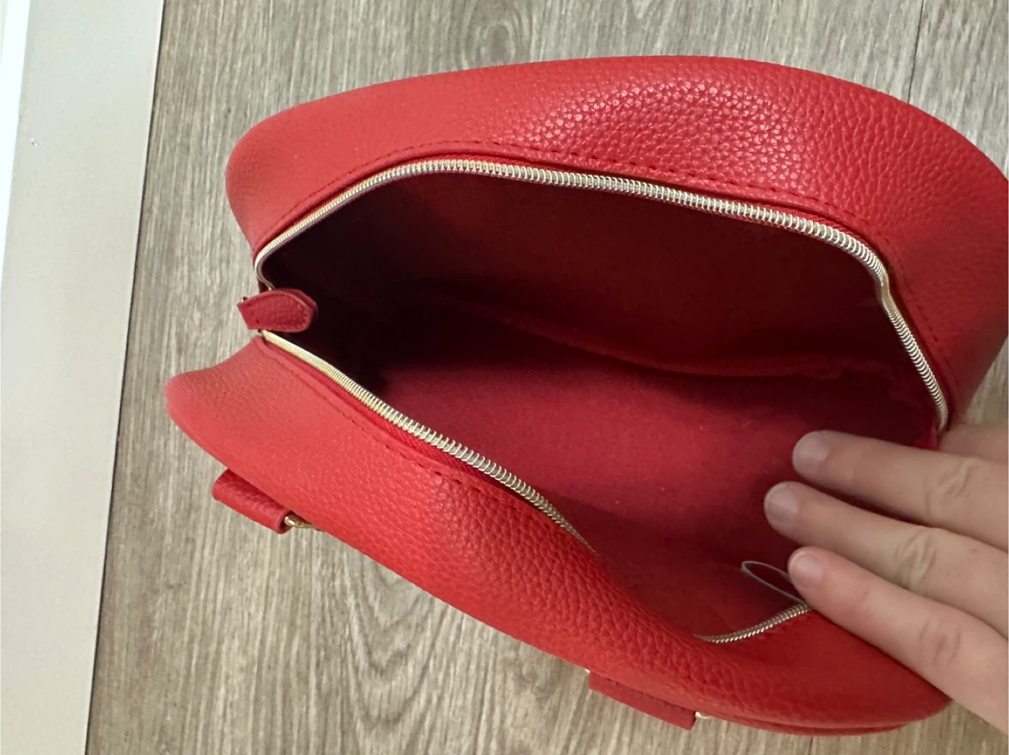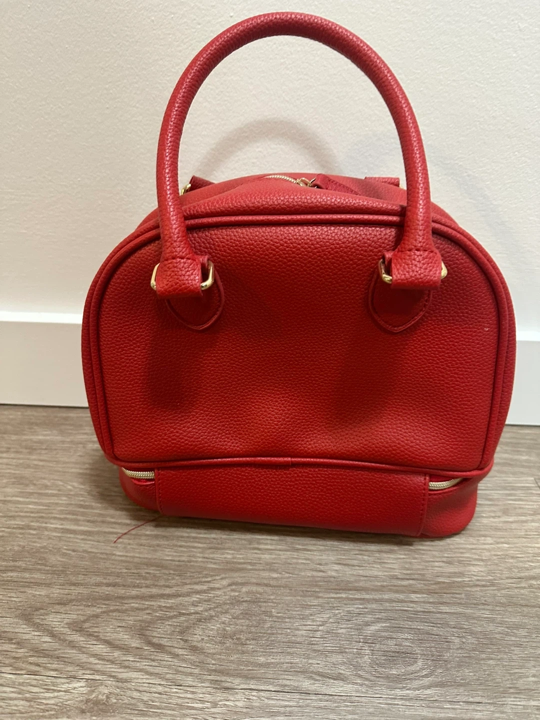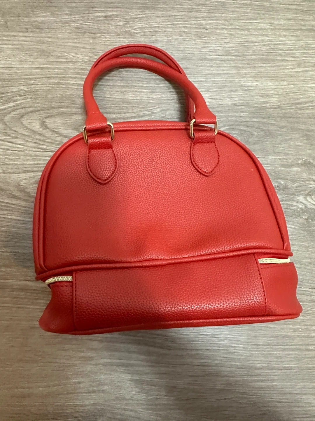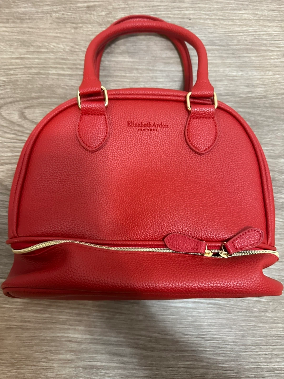 This is a cute red dome handbag from Elizabeth Arden. It's in great condition and perfect for carrying your essentials!