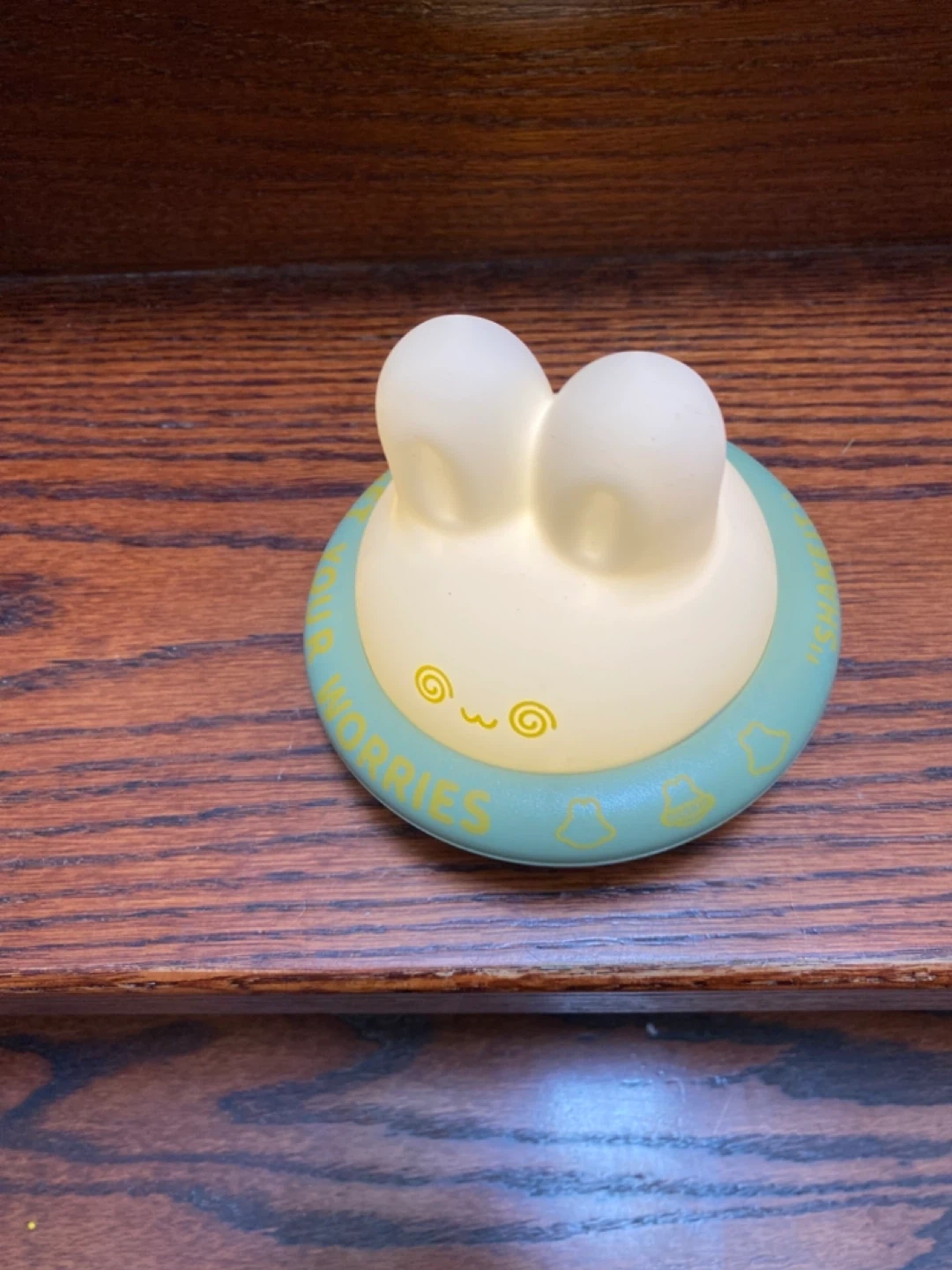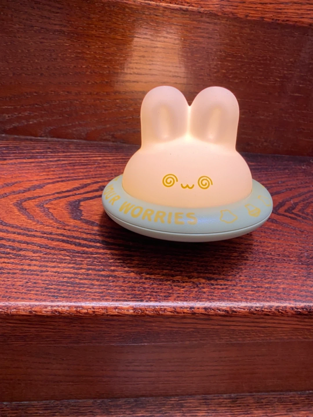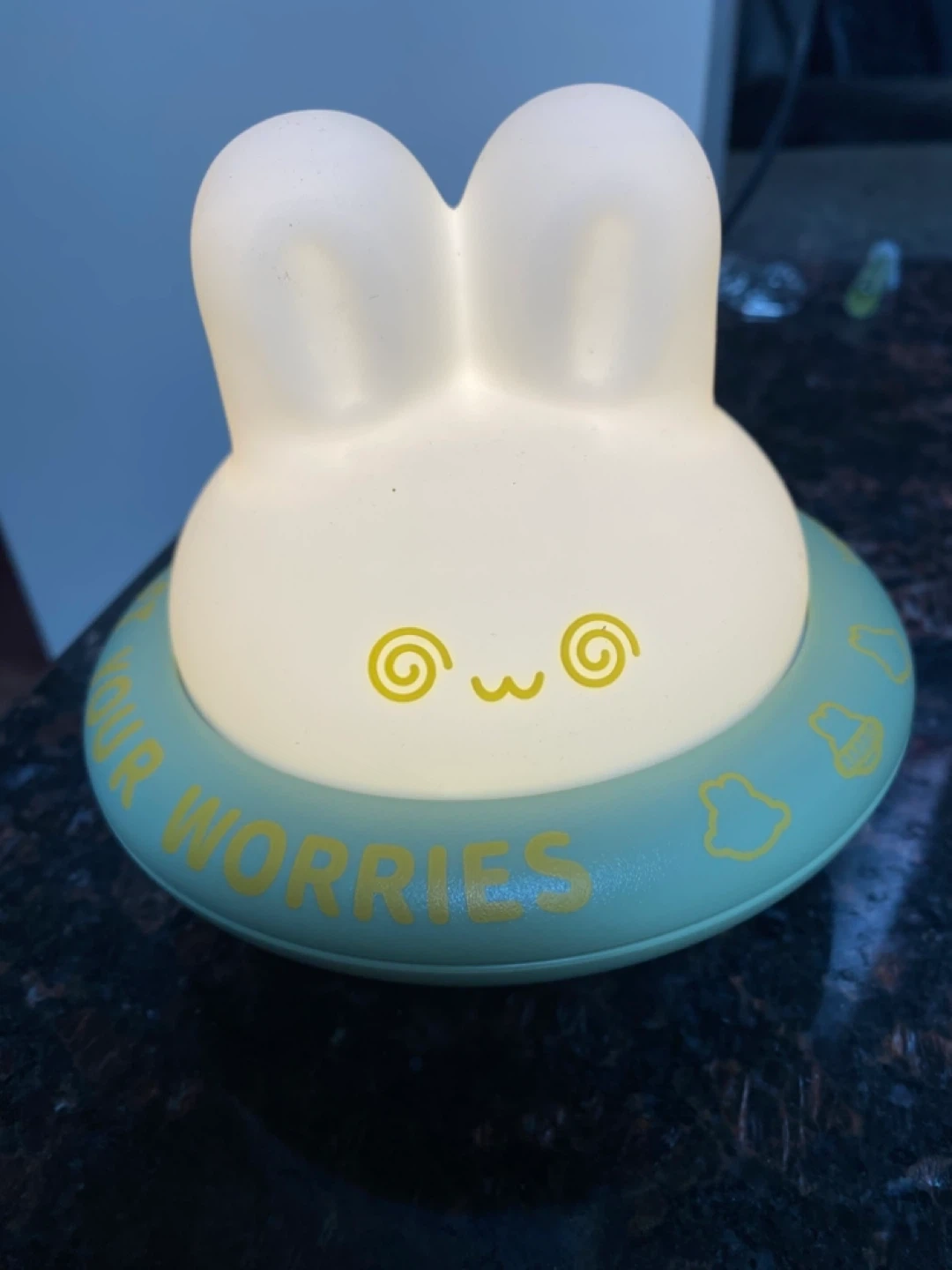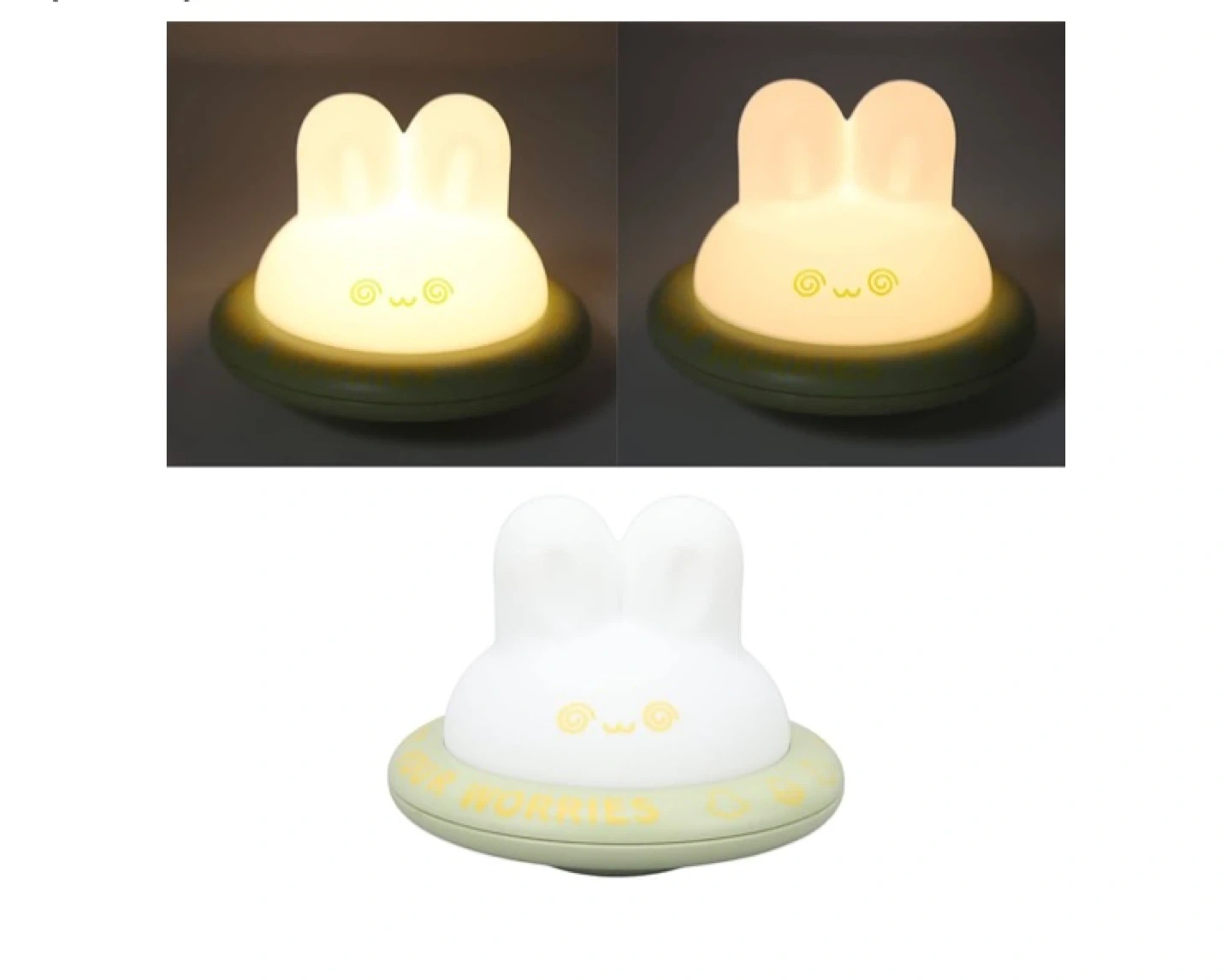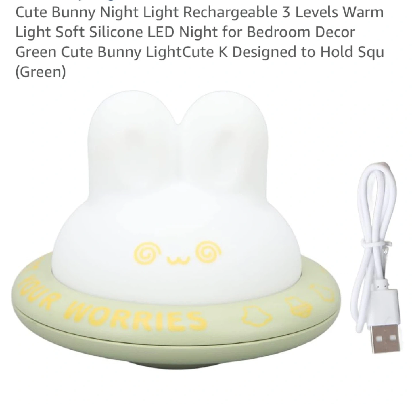 Cute bunny rechargeable night light with 3 levels of warm light. Made of soft silicone and includes a USB charging cable. It's designed to hold your worries!
