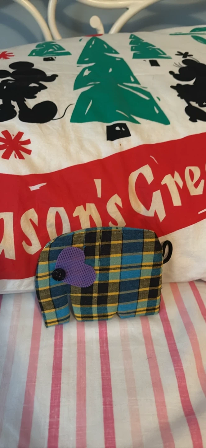 Cute plaid elephant pouch with a purple heart accent. Features a button eye and a black elastic loop on the back. Perfect for storing small items!