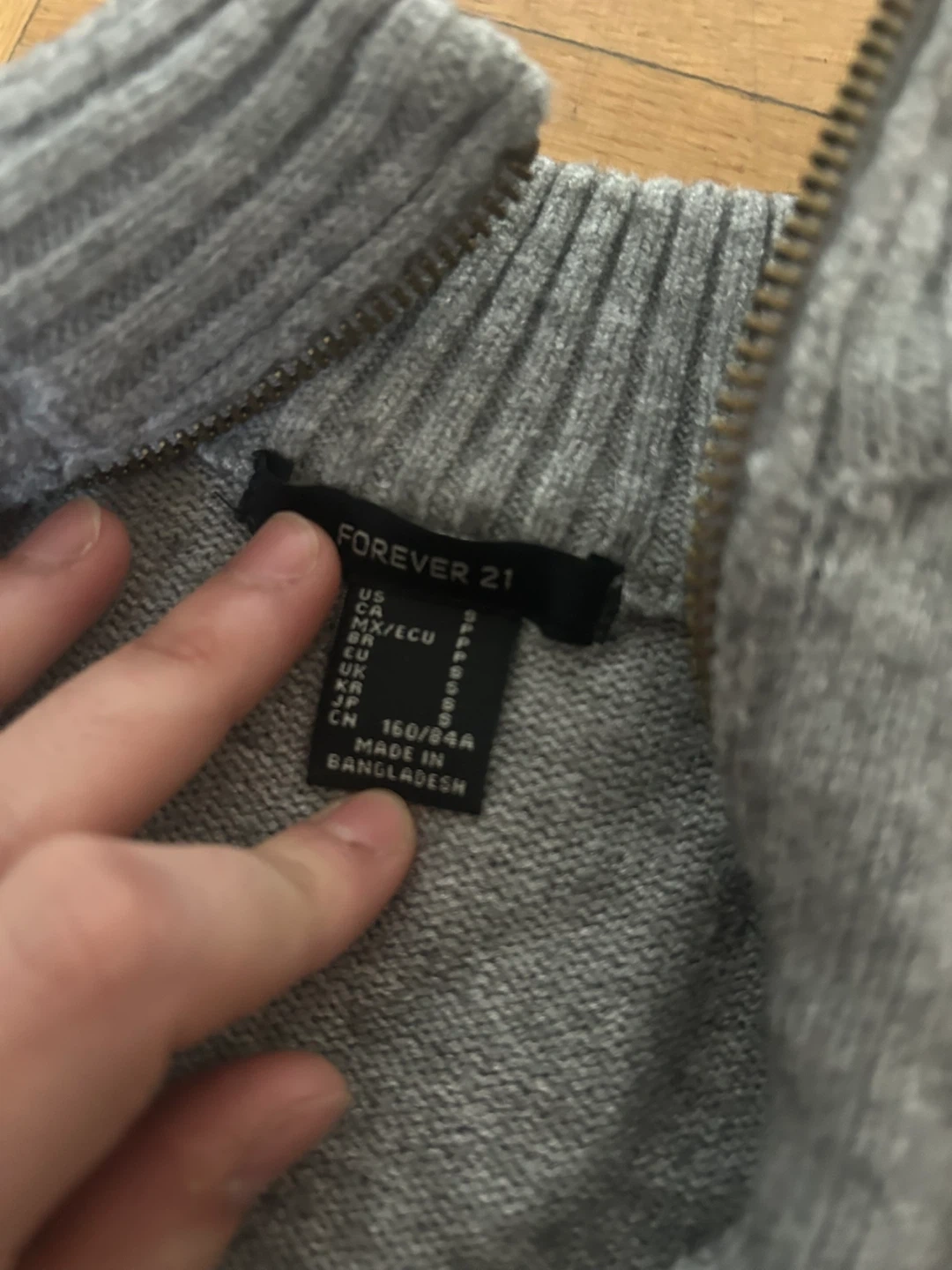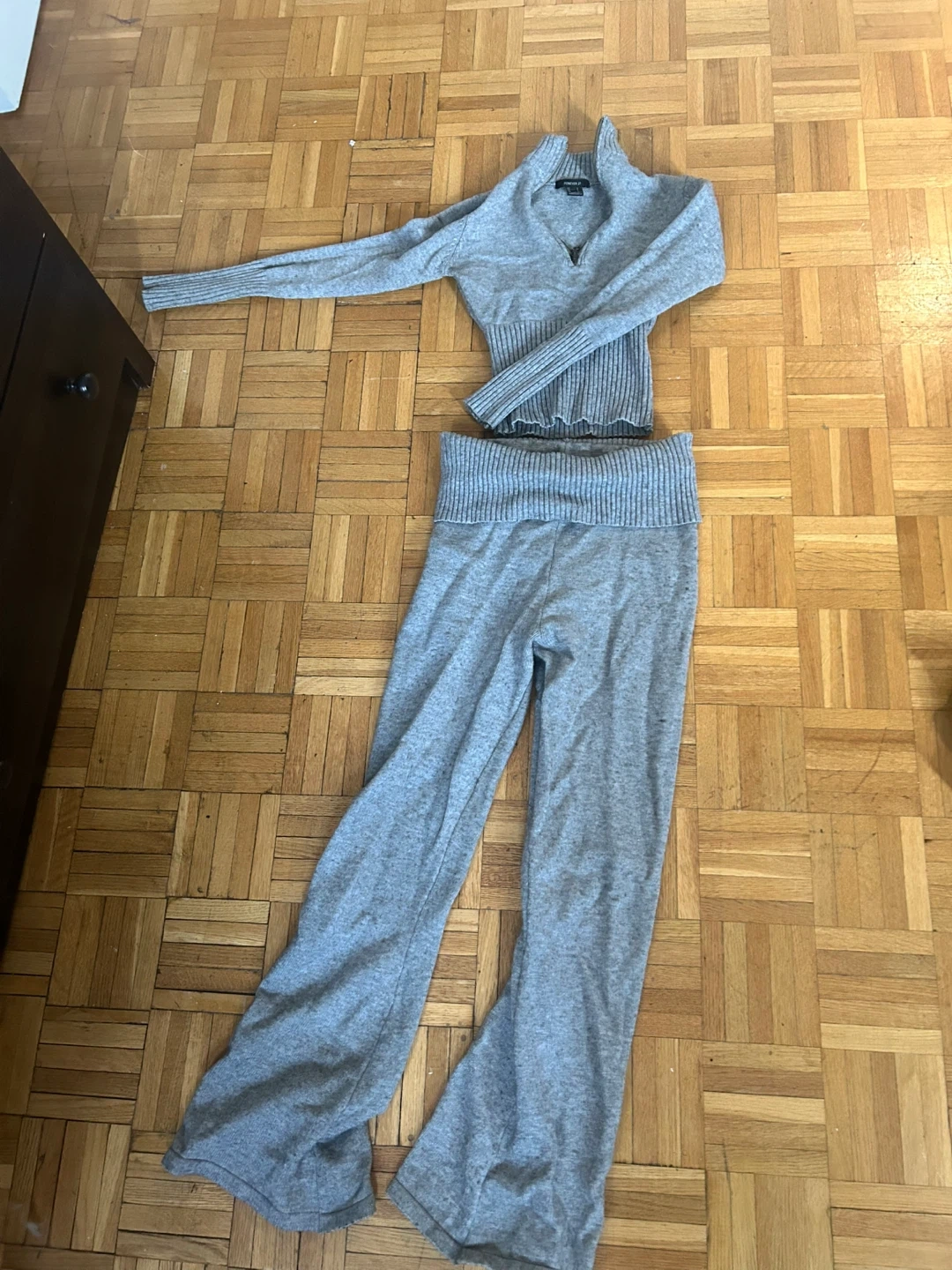 This is a grey sweater and pants set from Forever 21. The sweater has a quarter-zip neckline and ribbed detailing. The pants have a high waistband and flared legs. It's made of a soft knit material.