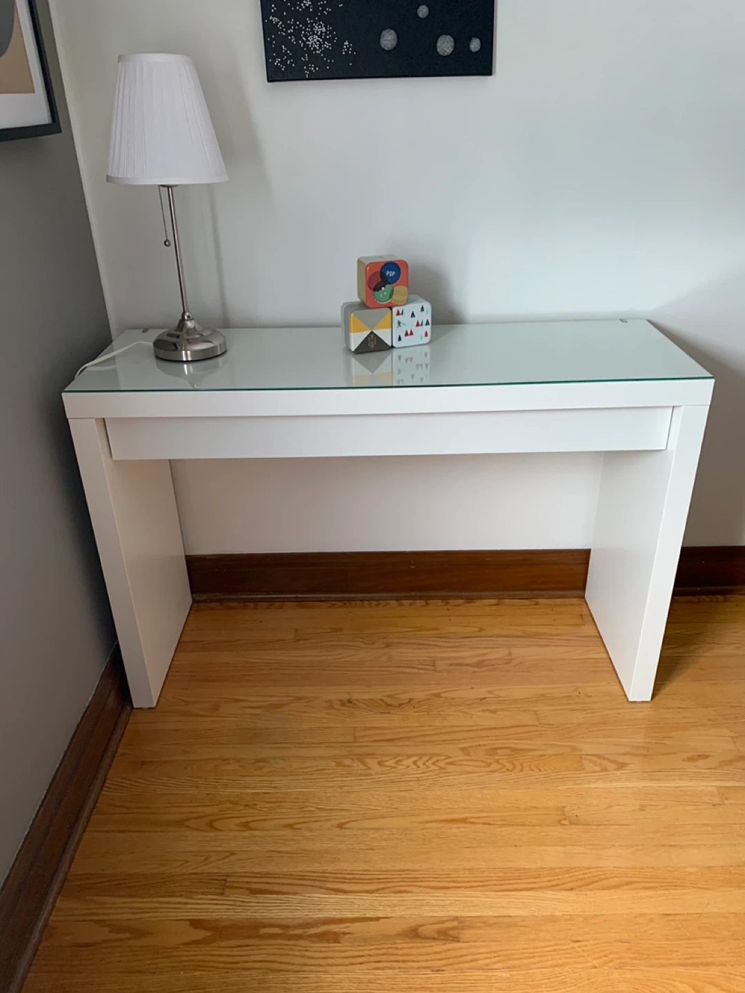This IKEA MALM console table features a sleek white finish and a durable glass top. It has one spacious drawer, perfect for storing essentials. The dimensions are 120.3 cm (47 5/8") wide, 41.0 cm (16 1/8") deep, and 77.4 cm (30 1/2") high. Its clean design makes it a versatile piece for any room.