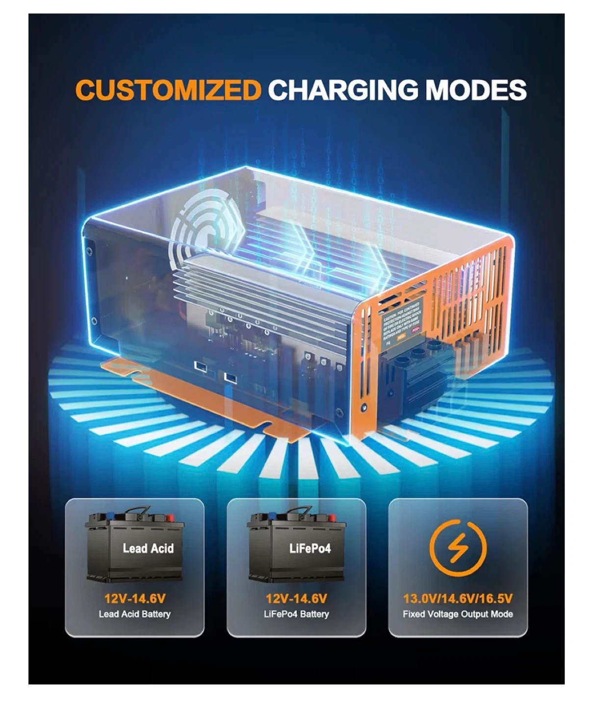 This unit includes multiple charging modes, allowing you to switch between battery types or use fixed voltage settings depending on your needs. You can select between 13.0V, 14.6V, and 16.5V output, which helps optimize charging and extend battery life.