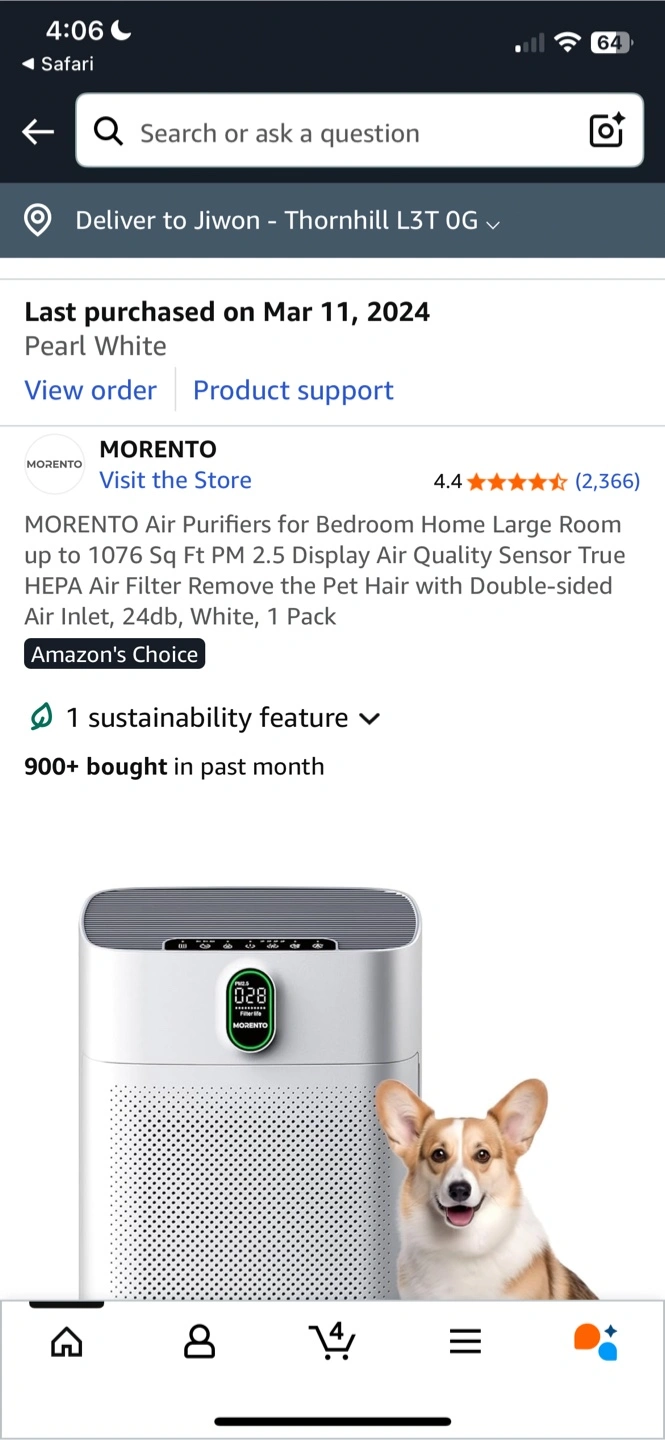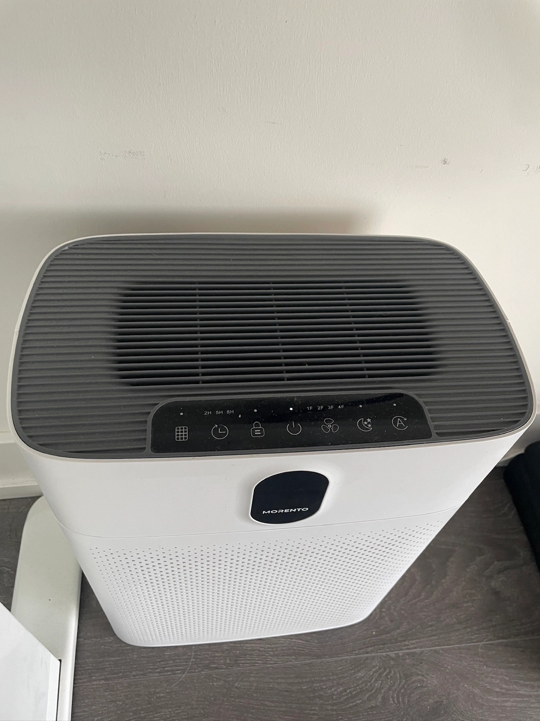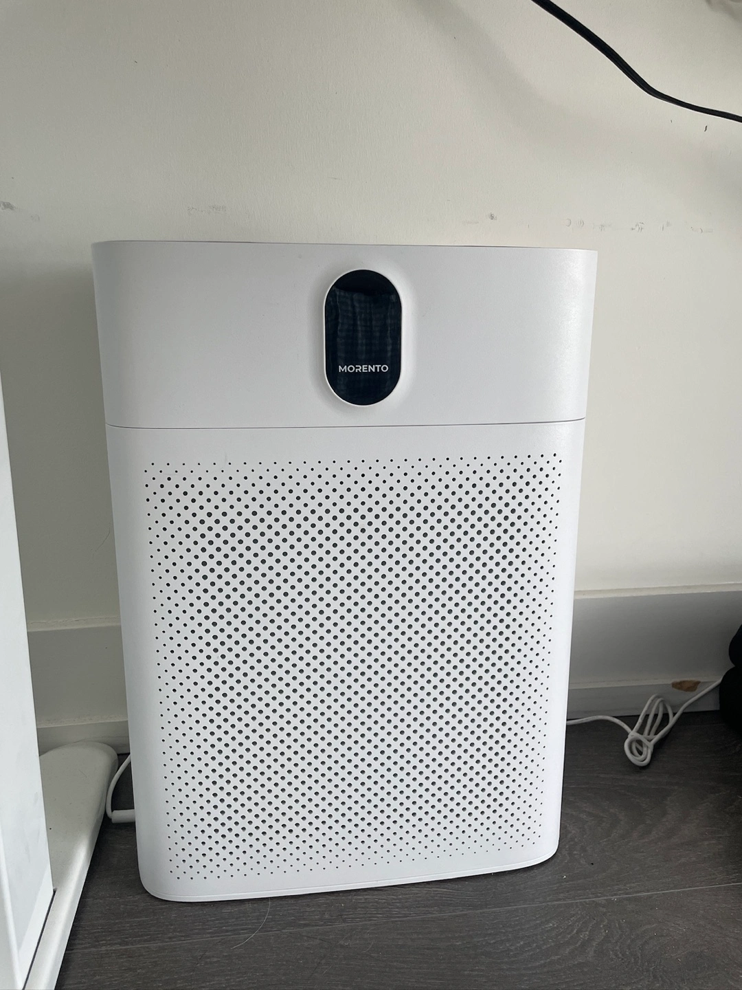 Selling a MORENTO air purifier in pearl white. It's perfect for a bedroom or large room, covering up to 1076 sq ft! It features a PM 2.5 display, air quality sensor, and a true HEPA air filter. It's great for removing pet hair with its double-sided air inlet, operating at 24dB. Comes with two extra filter.