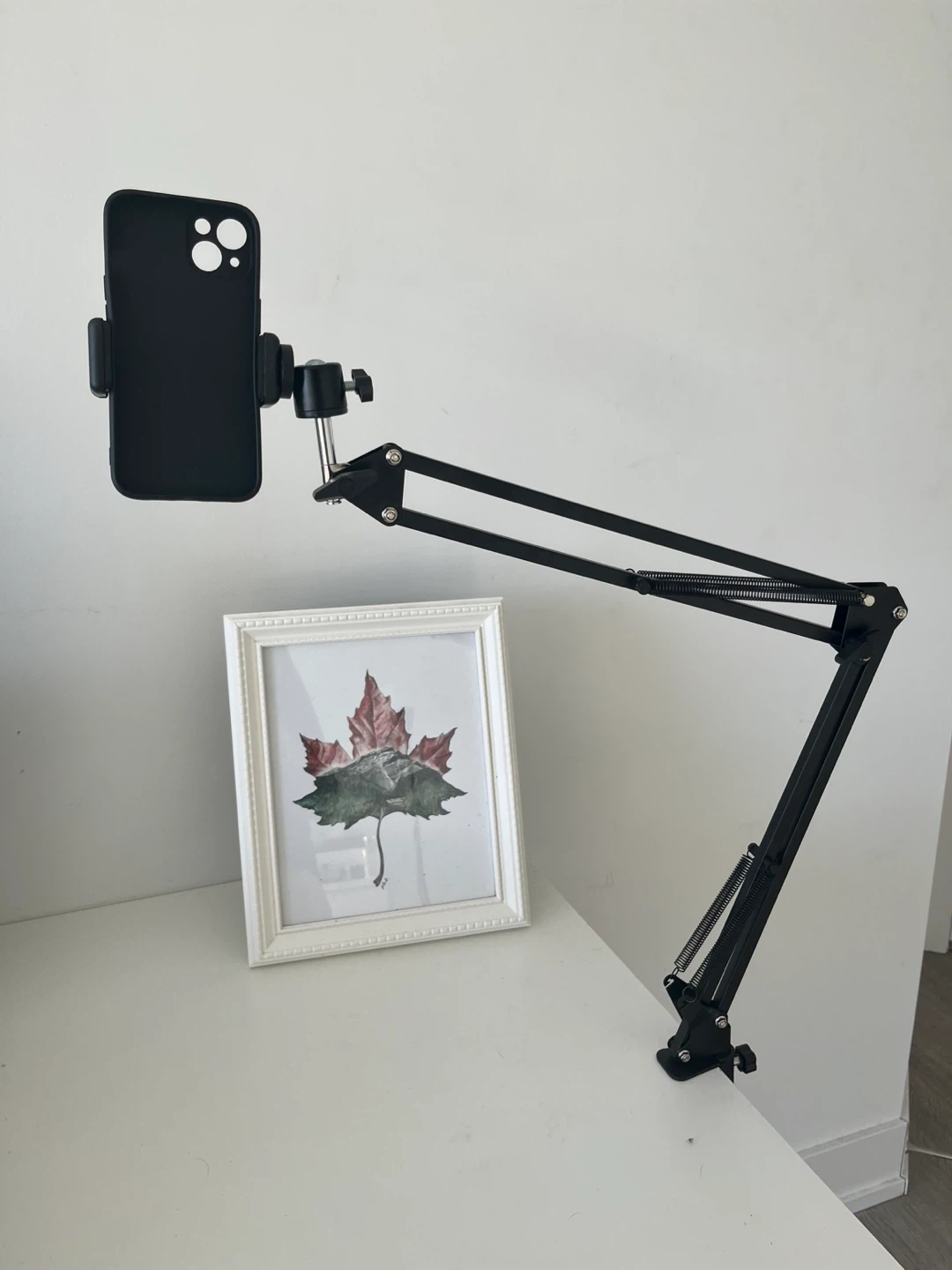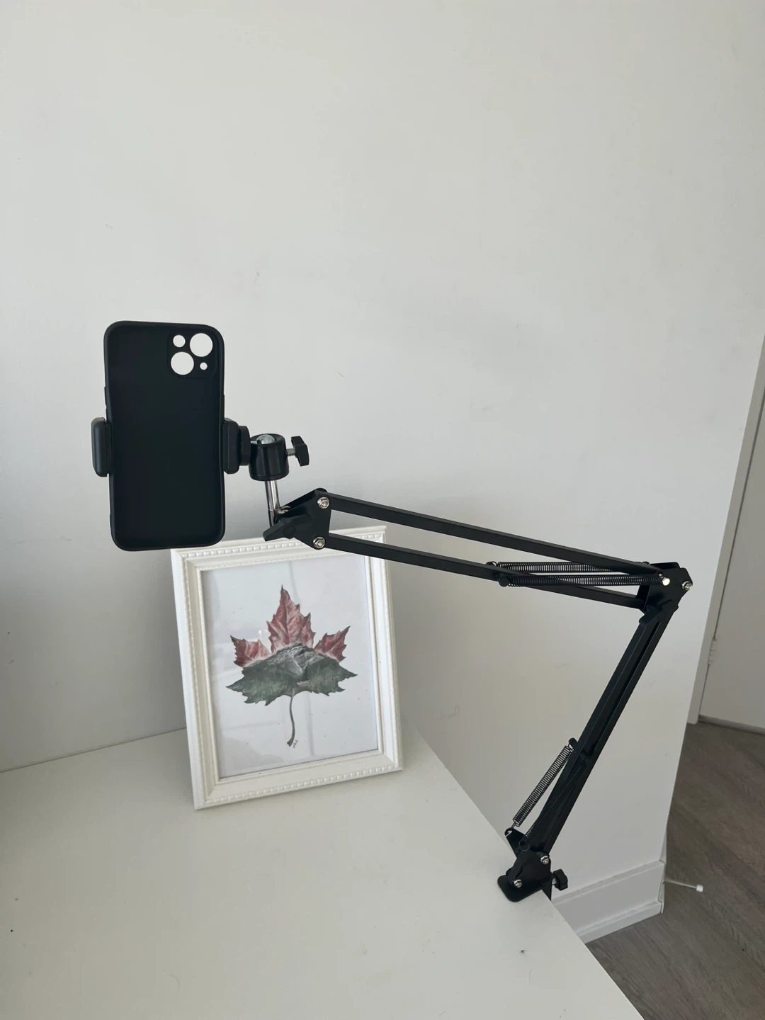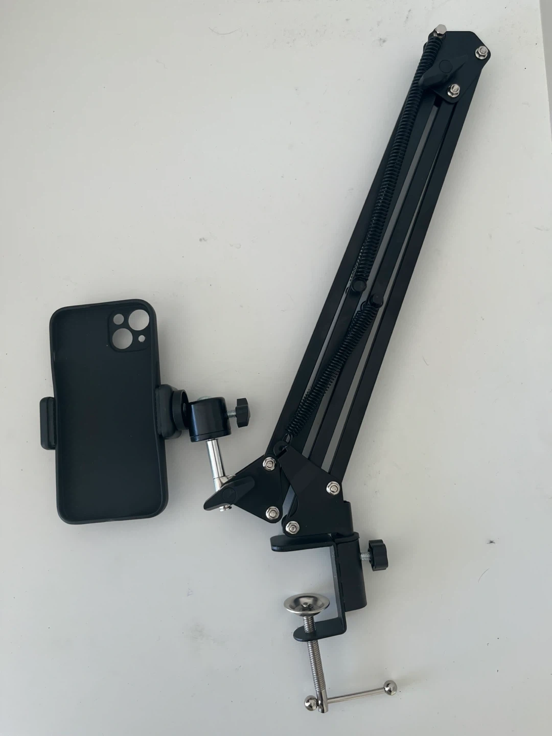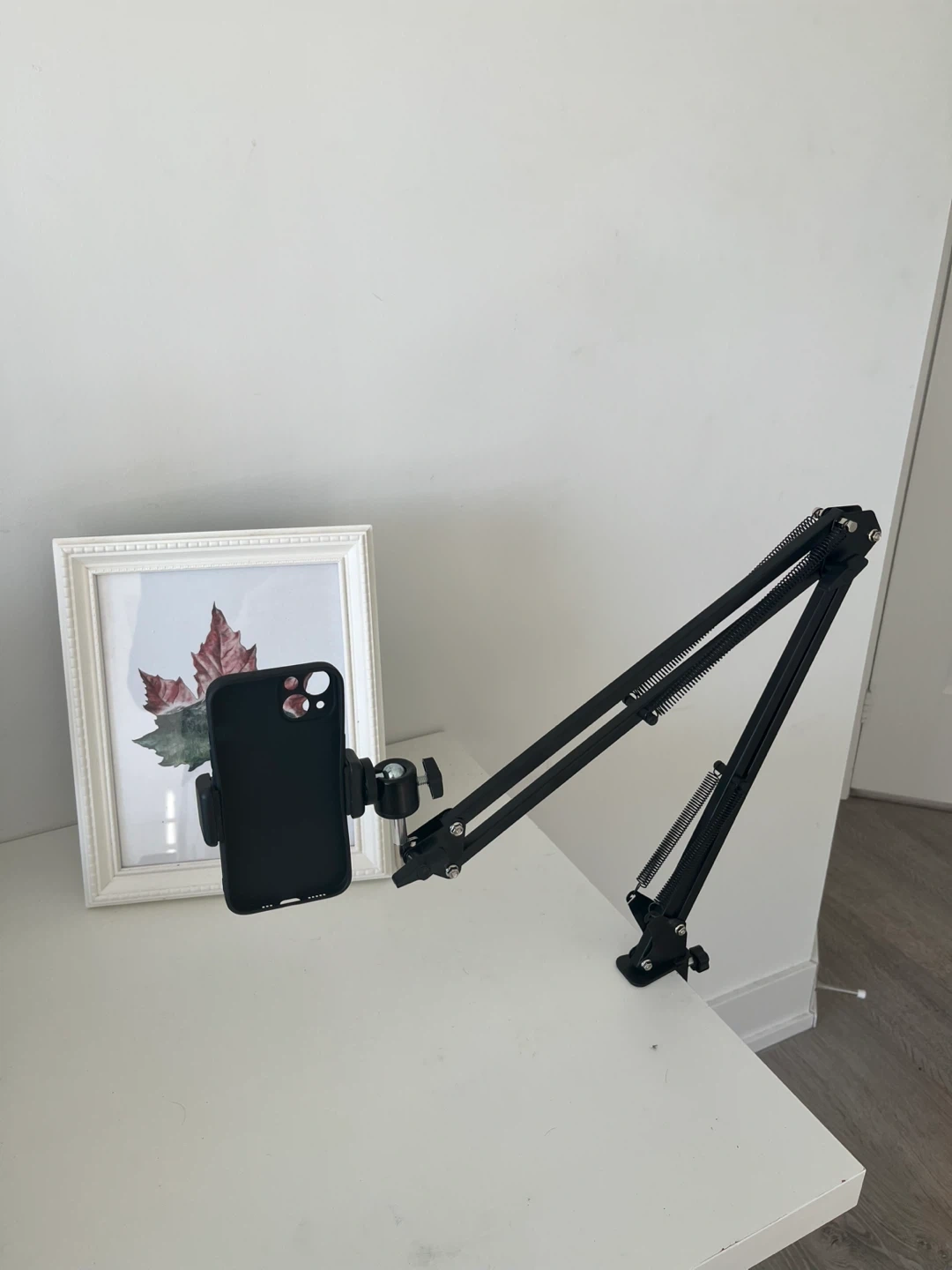 Adjustable desk mount stand for phones. It features a clamp base and a flexible arm with a phone holder. It's great for hands-free viewing or recording!