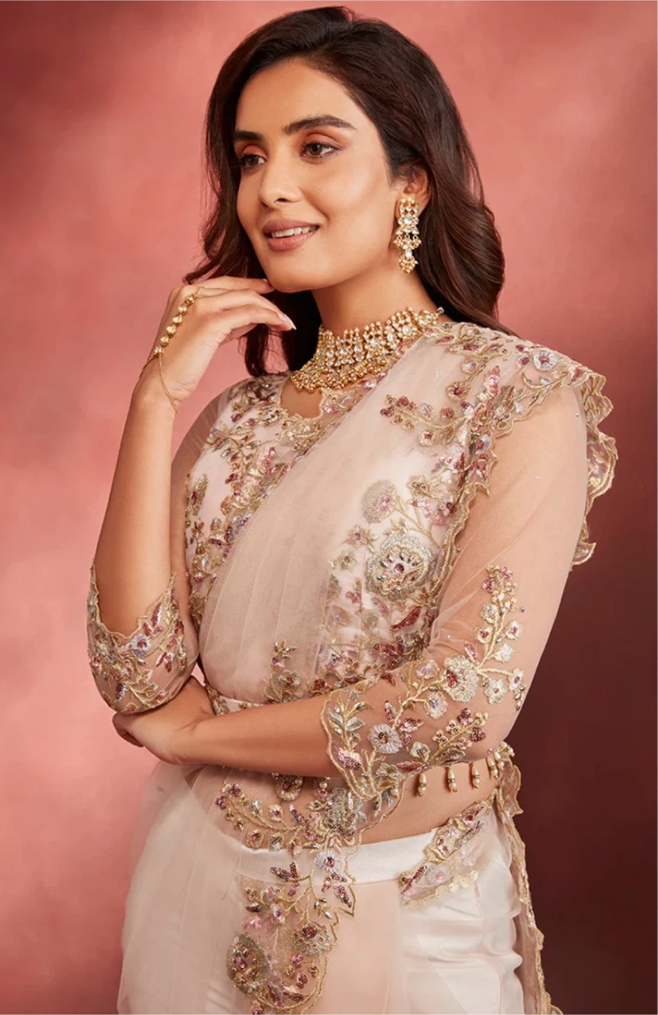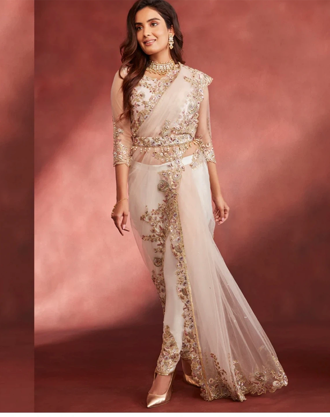 Stunning off-white saree featuring intricate embroidery and beadwork. Sheer sleeves with matching embellished trousers complete this elegant look. Bust: 38", Waist: 34", Hips: 42". Perfect for special occasions!